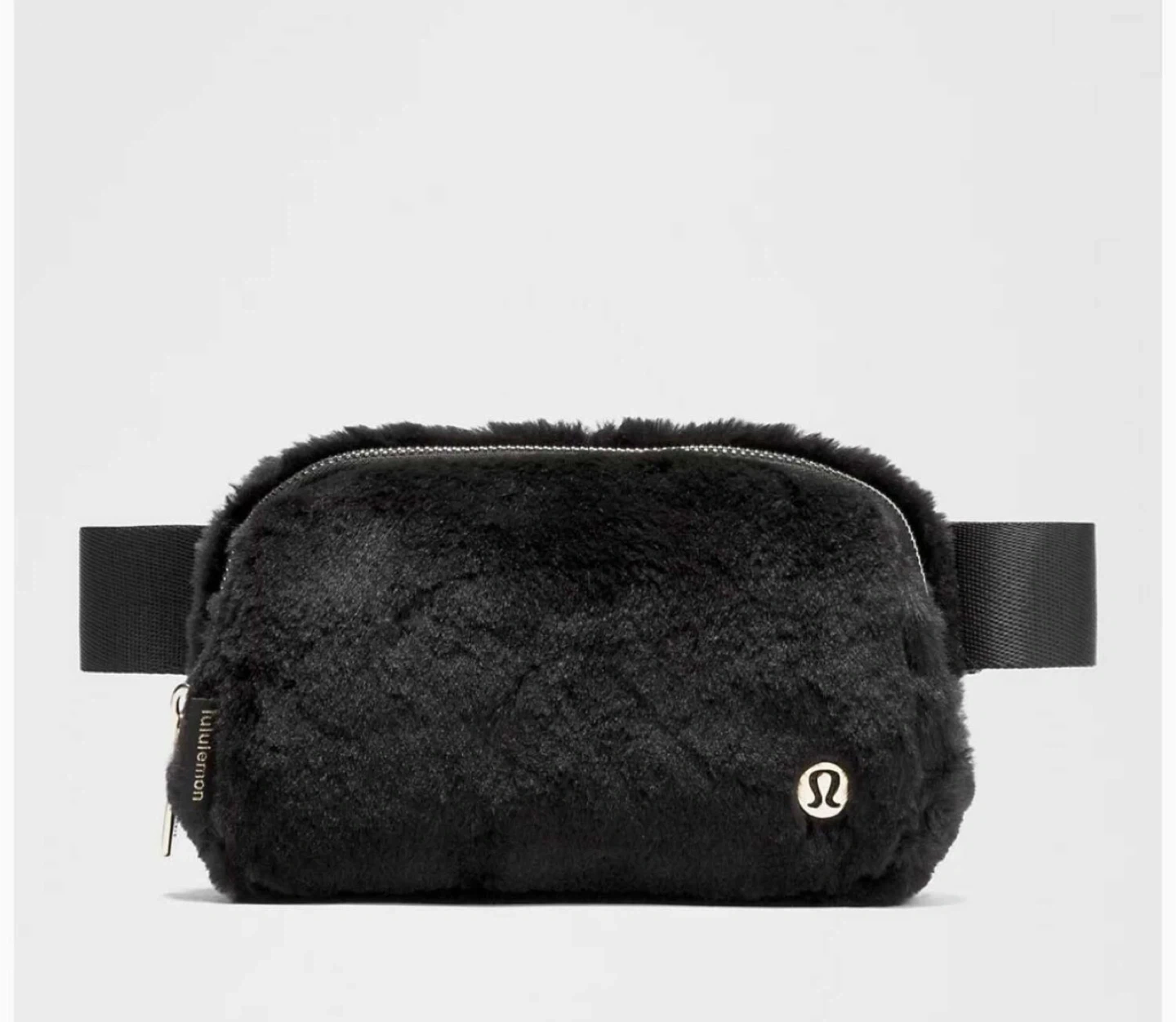 This Lululemon Everywhere Belt Bag is in great condition and made of soft fleece material. It's black, stylish, and perfect for keeping your essentials close at hand