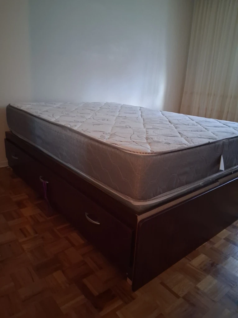 Selling a double bed frame with a mattress. It's in good condition and ready for a new home! Free comforter with bed