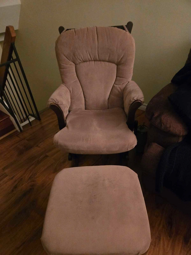 This is a gently used Storkcraft glider and ottoman, perfect for a nursery or any cozy space. It has a smooth gliding motion and is incredibly comfortable. The set shows signs of wear, as seen in the photos, but is still in good working condition with lots of life left. A similar set sells for around $300-$500, get it here for less! If you're reading this, the glider is still available—no need to ask! Grab this comfy duo before it floats away to another happy home!