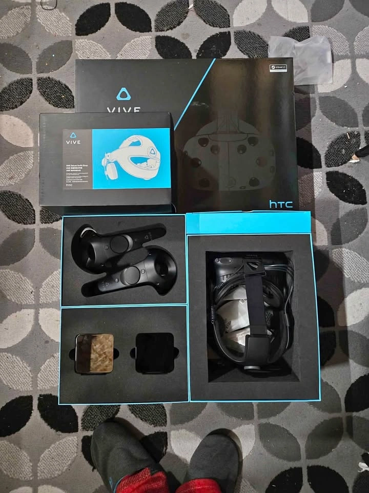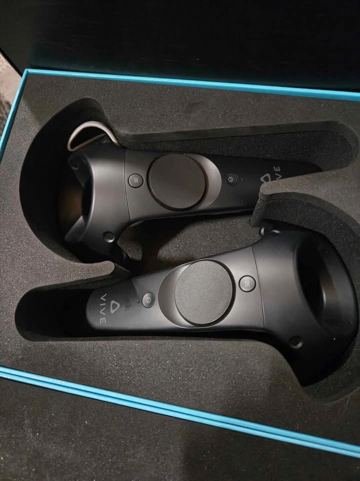 Great condition HTC Vive VR headset with controllers and accessories. Includes original packaging and manuals. Headset has been used but is in good working condition. Comes with extra headphones and other accessories.