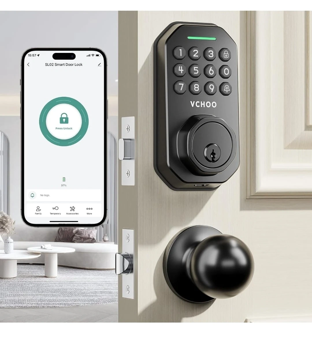 This VCHOO keyless entry door lock offers multiple ways to unlock, including app control, 100 user codes, one-time codes, and 2 spare keys. It also features WiFi control. It's designed for US left-handle and right-handle standard doors.
