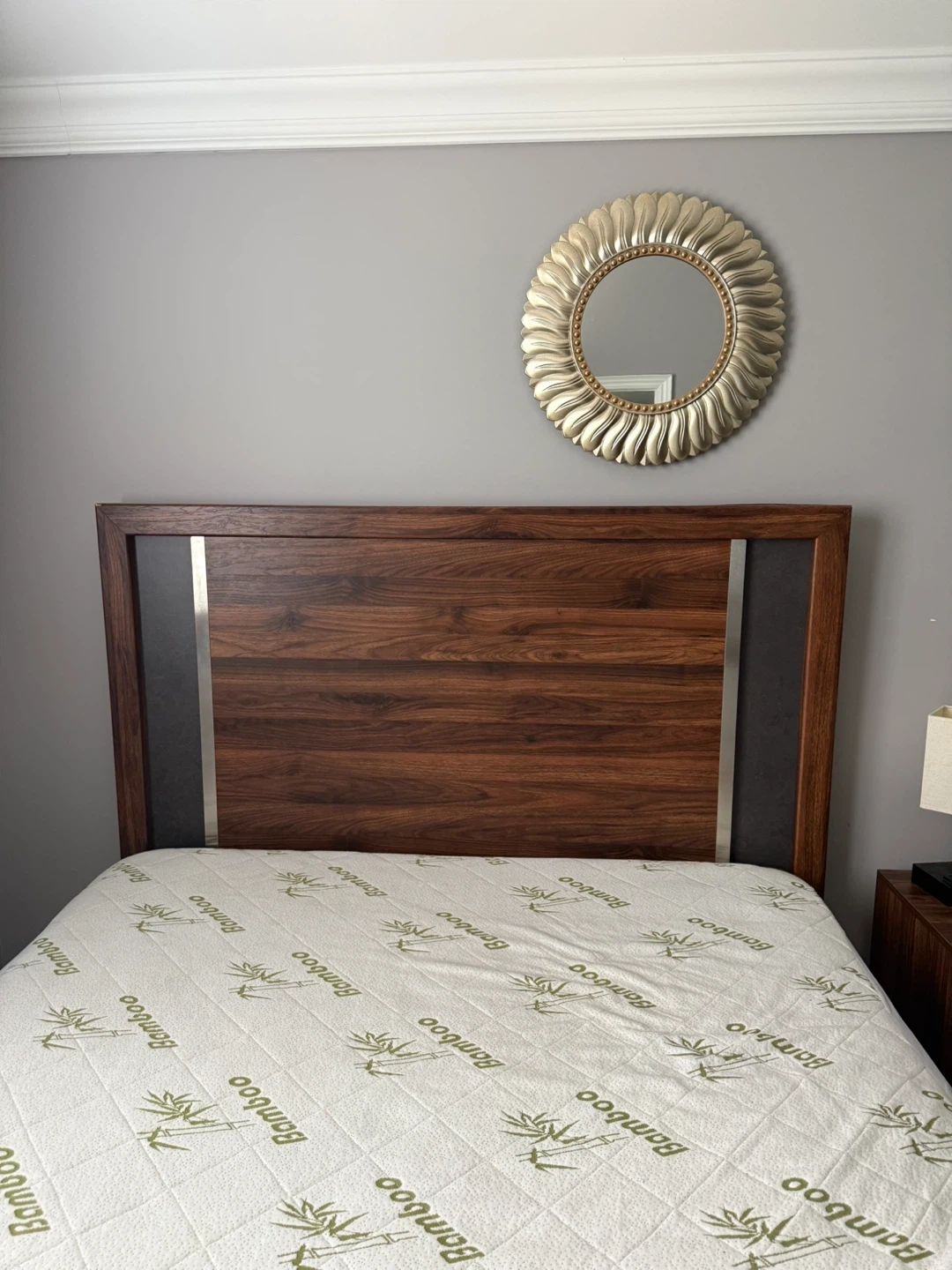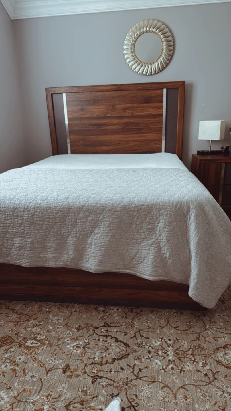 Selling a beautiful wood bedroom set that includes a bed frame and a dresser. The set features a rich wood finish with stylish accents. It's in great condition and would be a lovely addition to any bedroom!