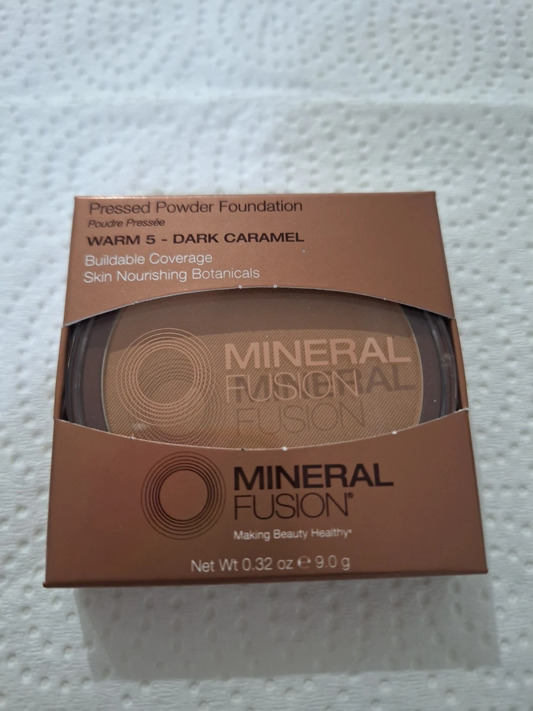 Selling a Mineral Fusion Pressed Powder Foundation in the Warm 5 - Dark Caramel shade! It offers buildable coverage and is made with skin-nourishing botanicals. Net weight is 0.32 oz (9.0 g)