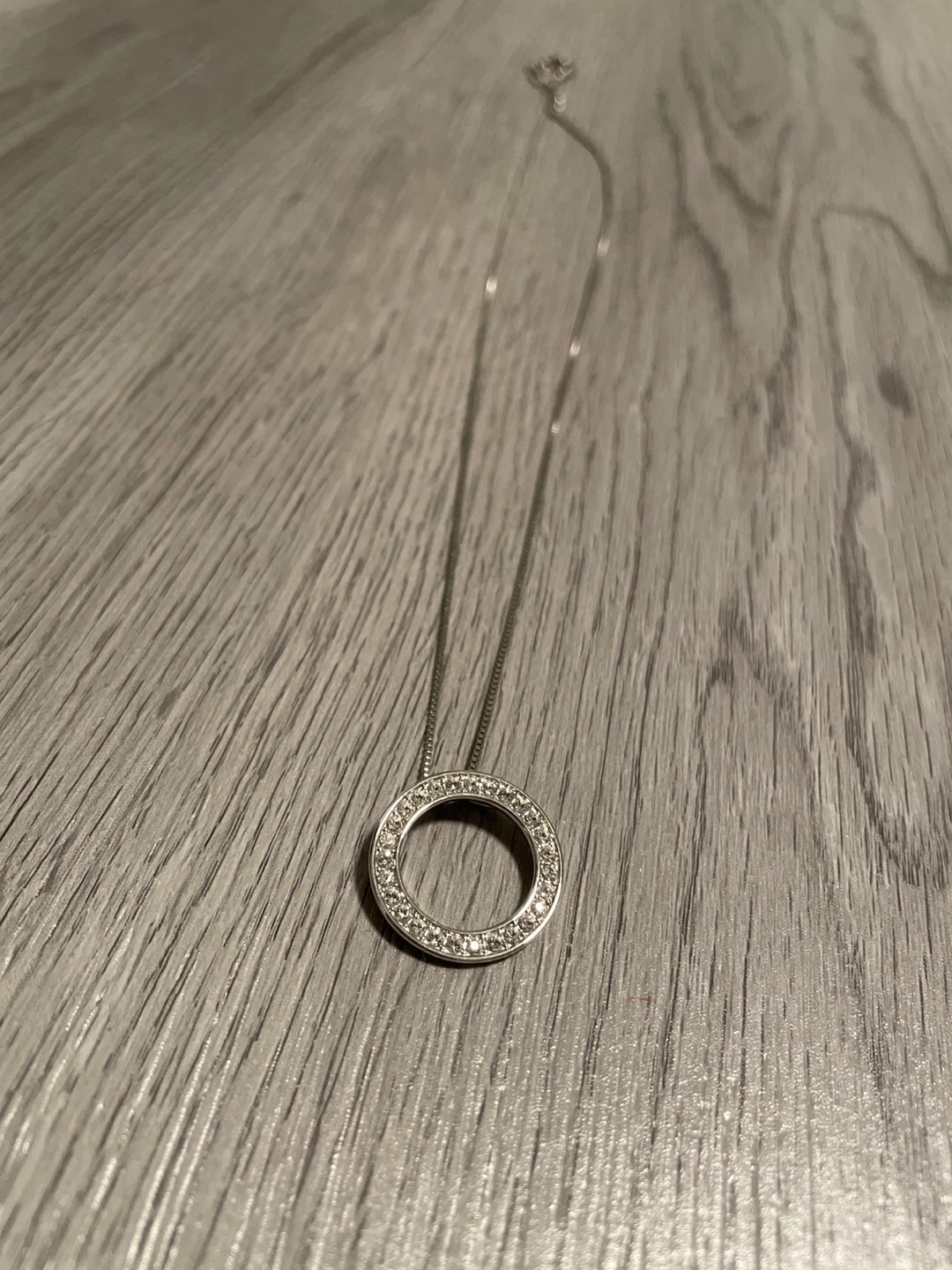 A lovely silver necklace featuring a circular pendant, perfect for adding a touch of sparkle to any outfit! The pendant is encrusted with small, clear stones that catch the light beautifully. It's in great condition and ready to be worn.