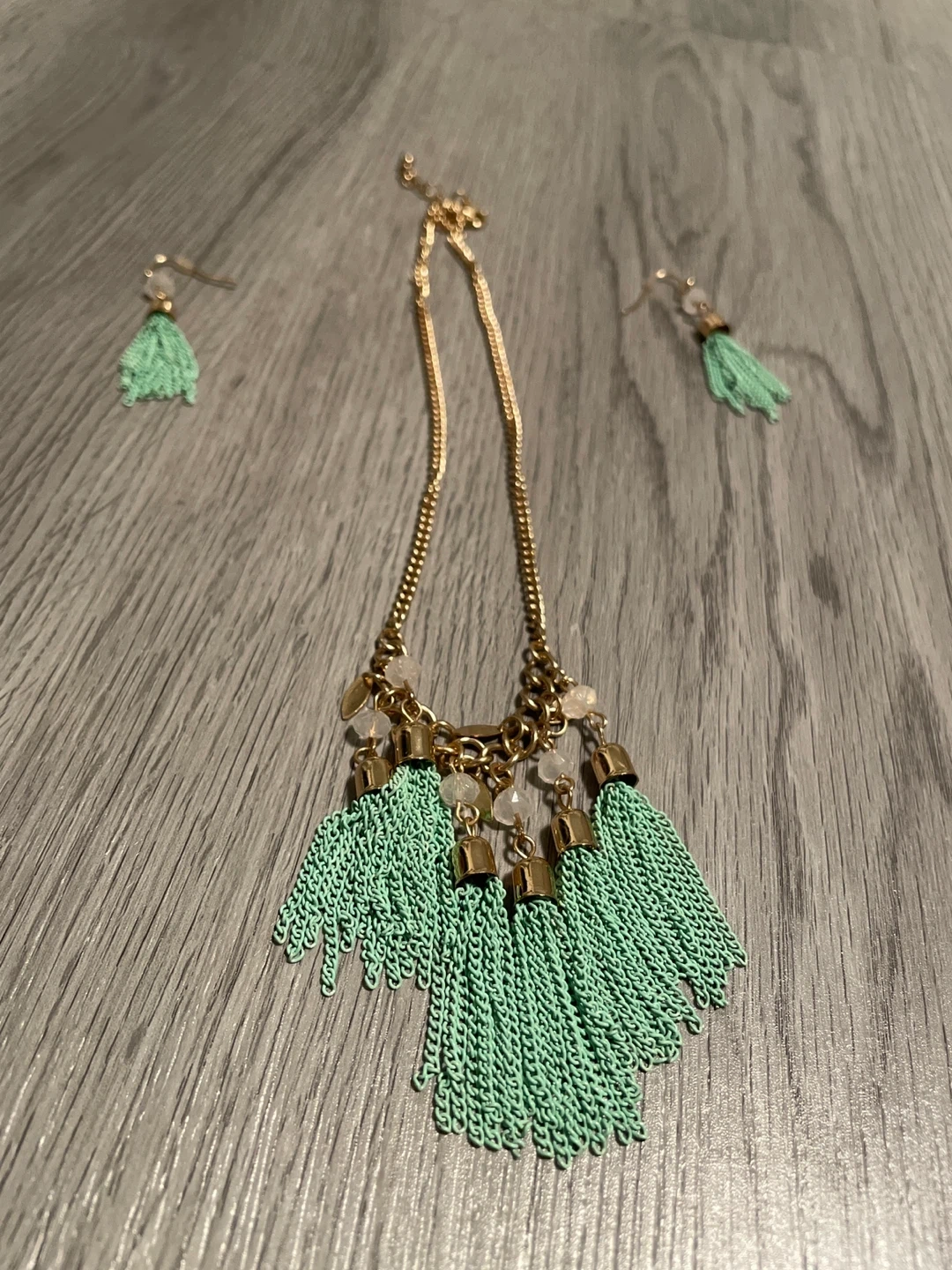 Cute matching necklace and earring set with a fun tassel design! The necklace has a gold chain and the tassels are a lovely mint green colour. Perfect for adding a pop of colour to any outfit