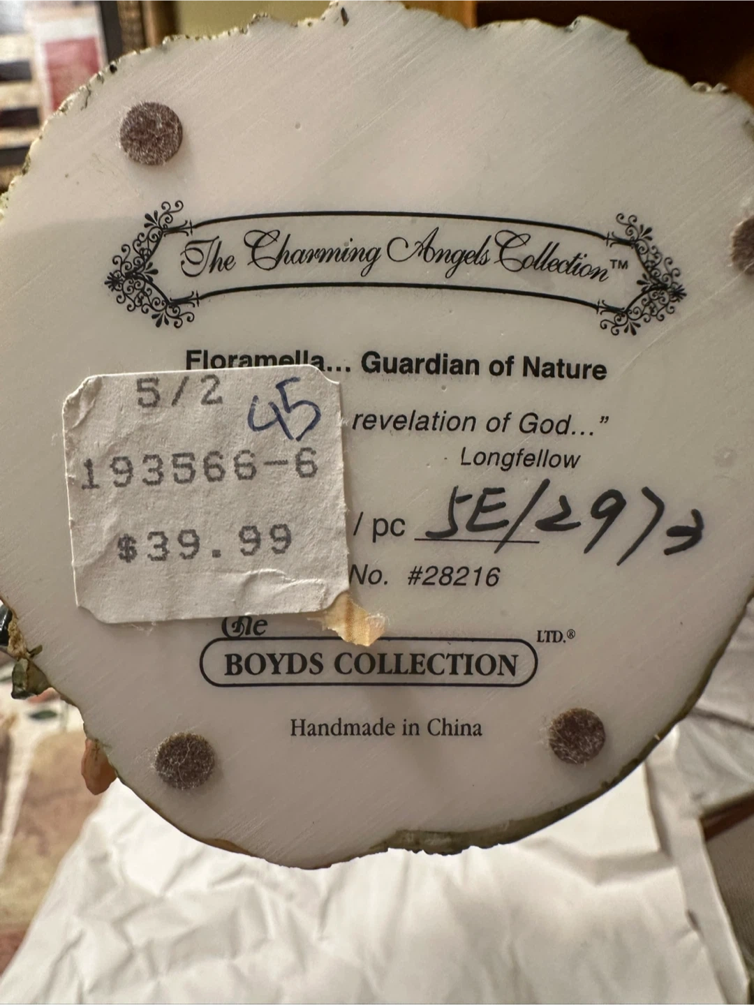 68This is a charming angel figurine from The Boyds Collection! It's called Floramella... Guardian of Nature and is part of The Charming Angels Collection. It's a lovely piece with intricate details of animals and flowers around the base. Originally bought for $39.99