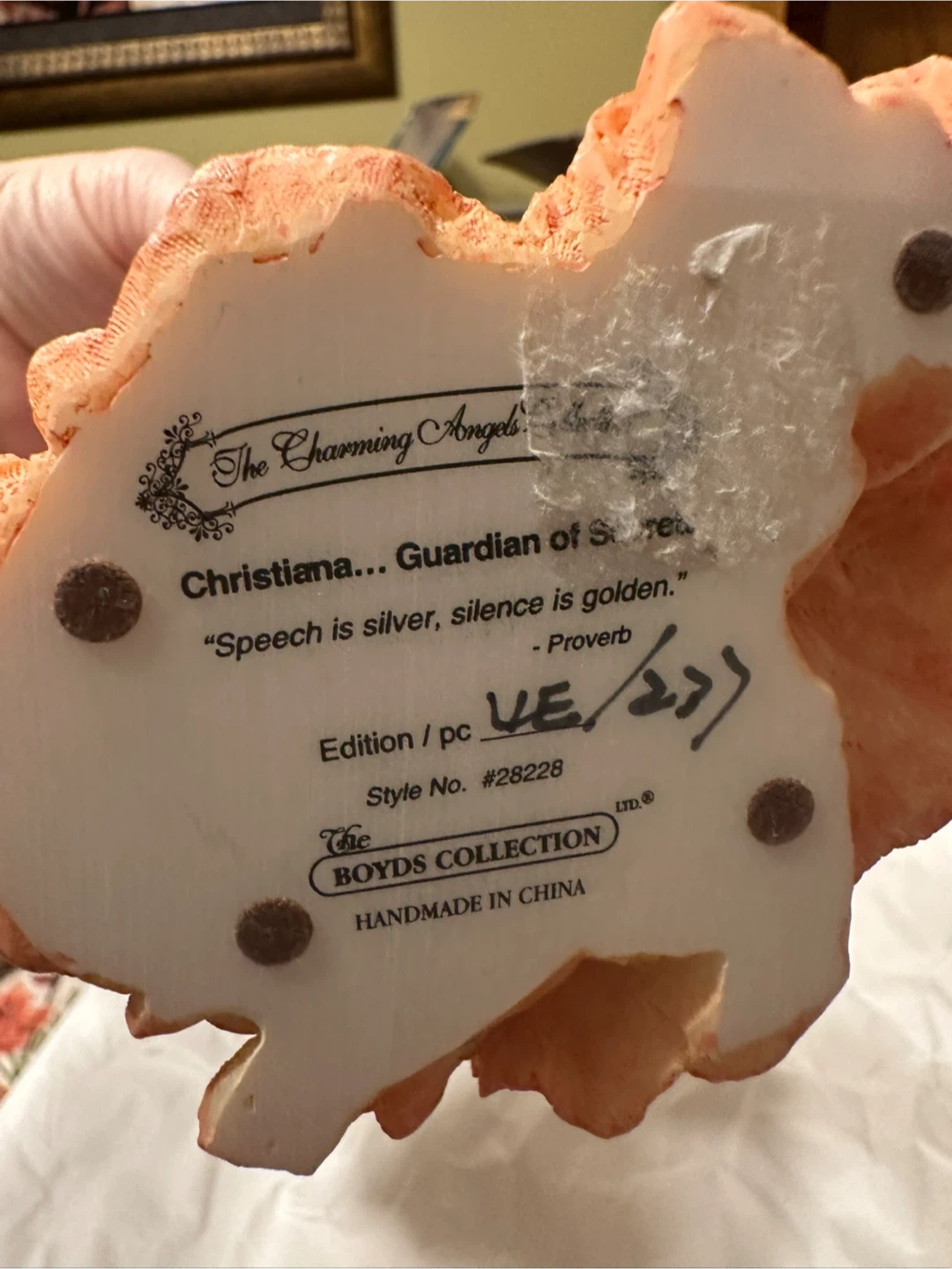 68This is a beautiful figurine from The Charming Angels collection. It's called Christiana... Guardian of Secrets. The figurine is made by The Boyds Collection and the style number is #28228. It's in great condition!