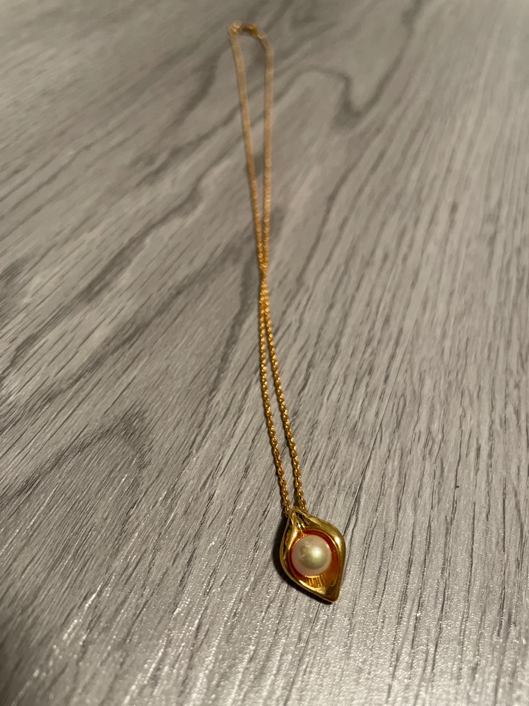 Selling a lovely gold necklace with a pearl pendant. It's in great condition and has a delicate chain. The pearl has a nice sheen to it, making it a beautiful accessory for any outfit!