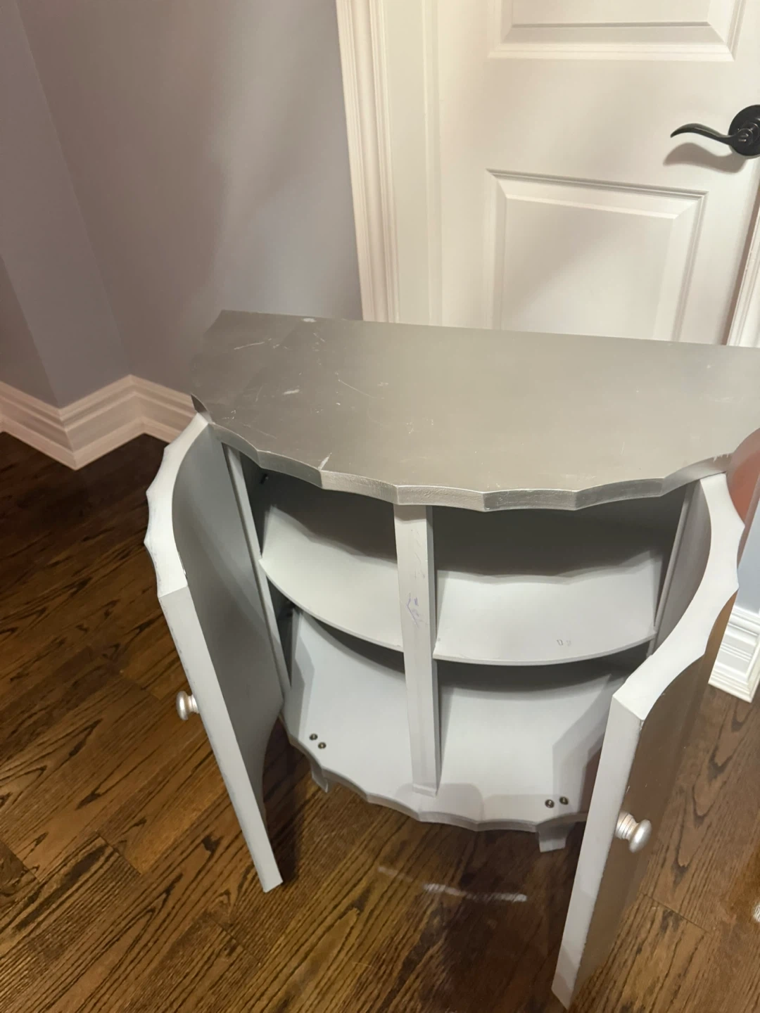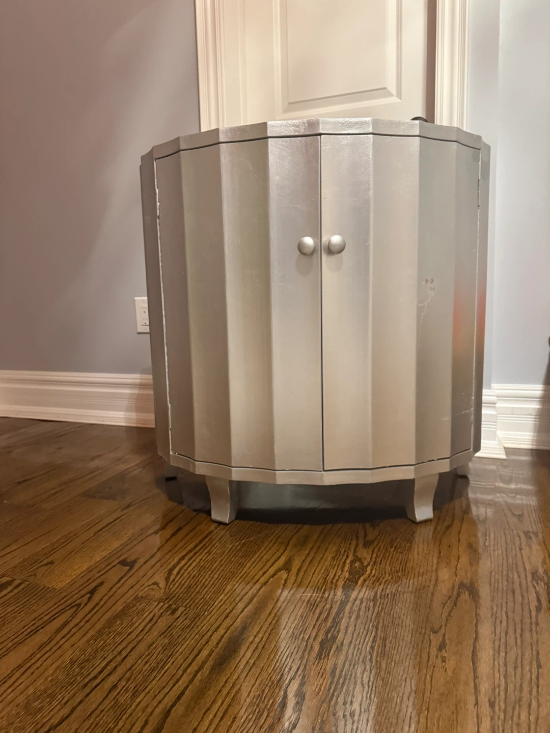 Selling a silver accent cabinet. It has a unique design with fluted doors and silver hardware. There are two shelves inside for storage. It would be a great addition to any room!