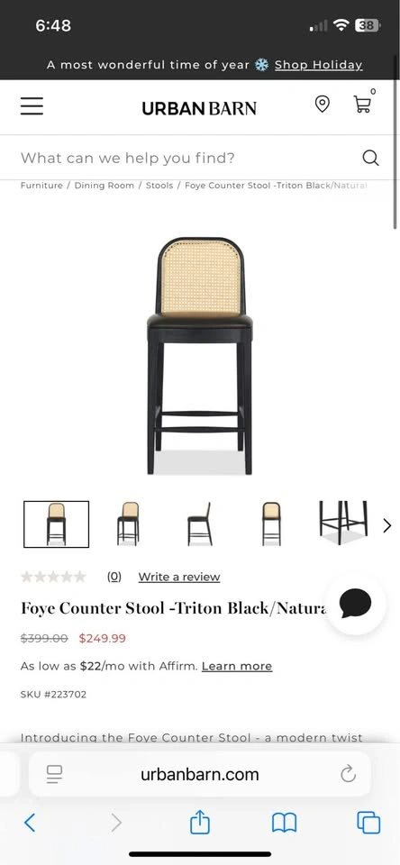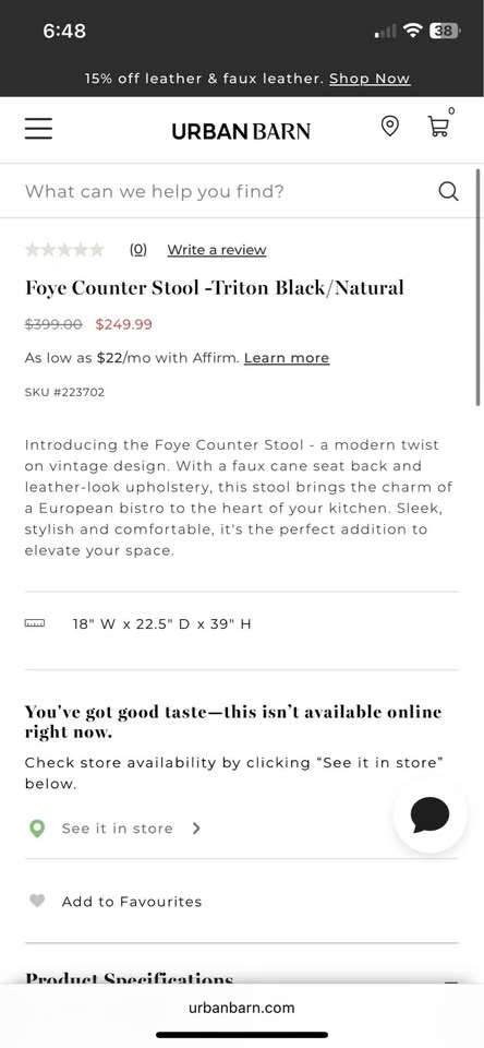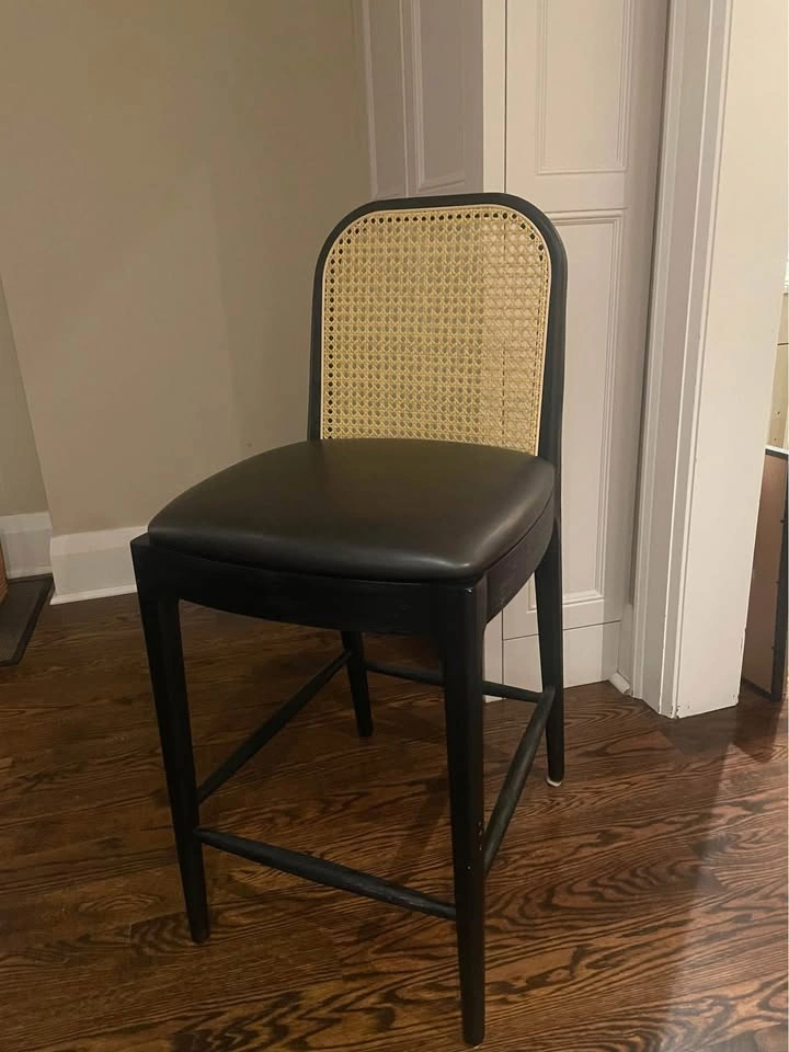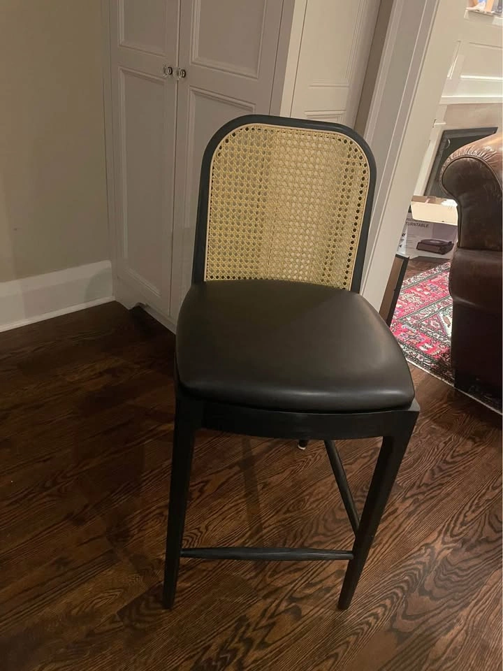 A modern twist on vintage design. With a faux cane seat back and leather-look upholstery. Currently out of stock on Urban Barn website but priced at $249.99 on sale from $399. Has some scratches on leg (as shown).