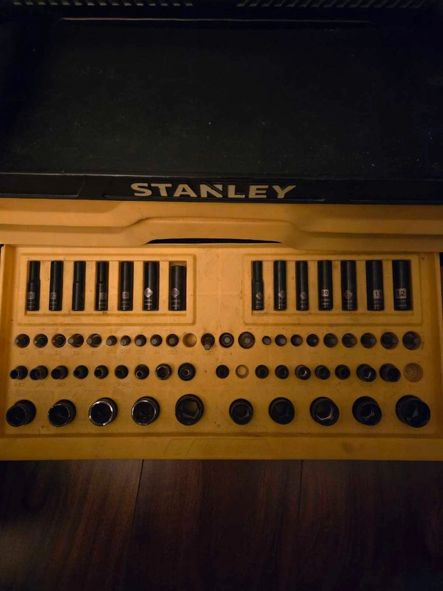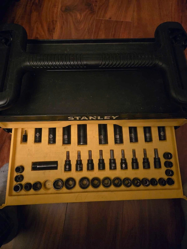 I'm selling a used Stanley tool box complete with a comprehensive set of tools. This set is perfect for both professional tradespeople and DIY enthusiasts looking for a reliable and sturdy tool storage solution. This item is in used condition, so please take this into consideration when making your purchase.