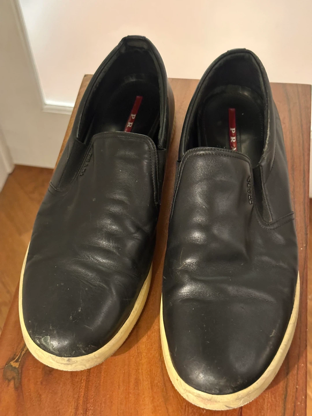 Prada . Super Retro cool .Selling a pair of Prada black leather slip-on sneakers. They show some signs of wear, but still have lots of life left. Perfect for casual outings! Size 12