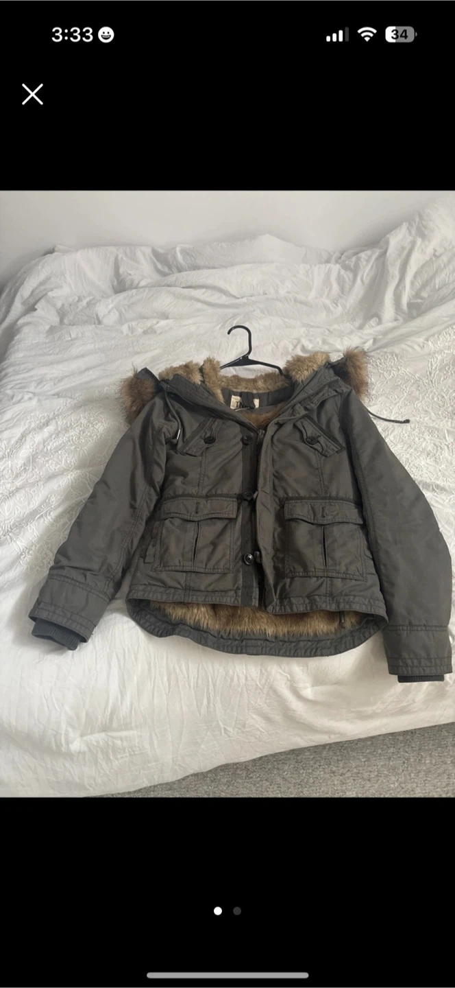 Here's a TNA winter jacket in olive green! It has a fur-lined hood and interior to keep you warm during the colder months pick up cash only