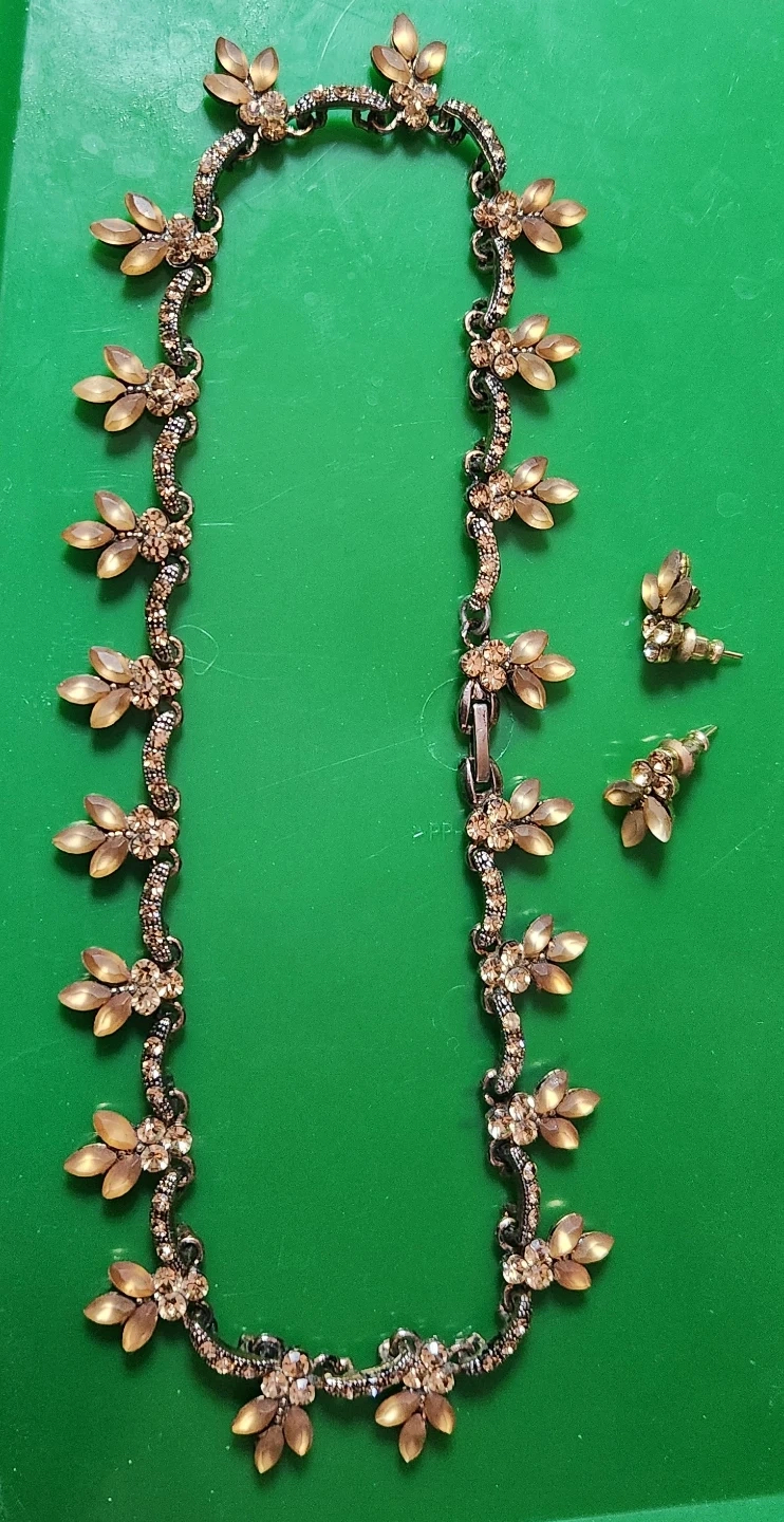 A beautiful necklace and earring set! The set features a bronze-tone metal with sparkling rhinestones and leaf-shaped accents. Perfect for adding a touch of elegance to any outfit. Necklace is 14" long.