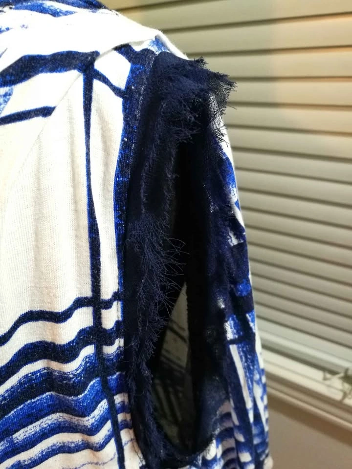 Excellent condition asymmetric modern printed sleeveless blouse. Feathered fuzzy sleeve edges. Cotton material. Size xs, but fits larger, like size S.