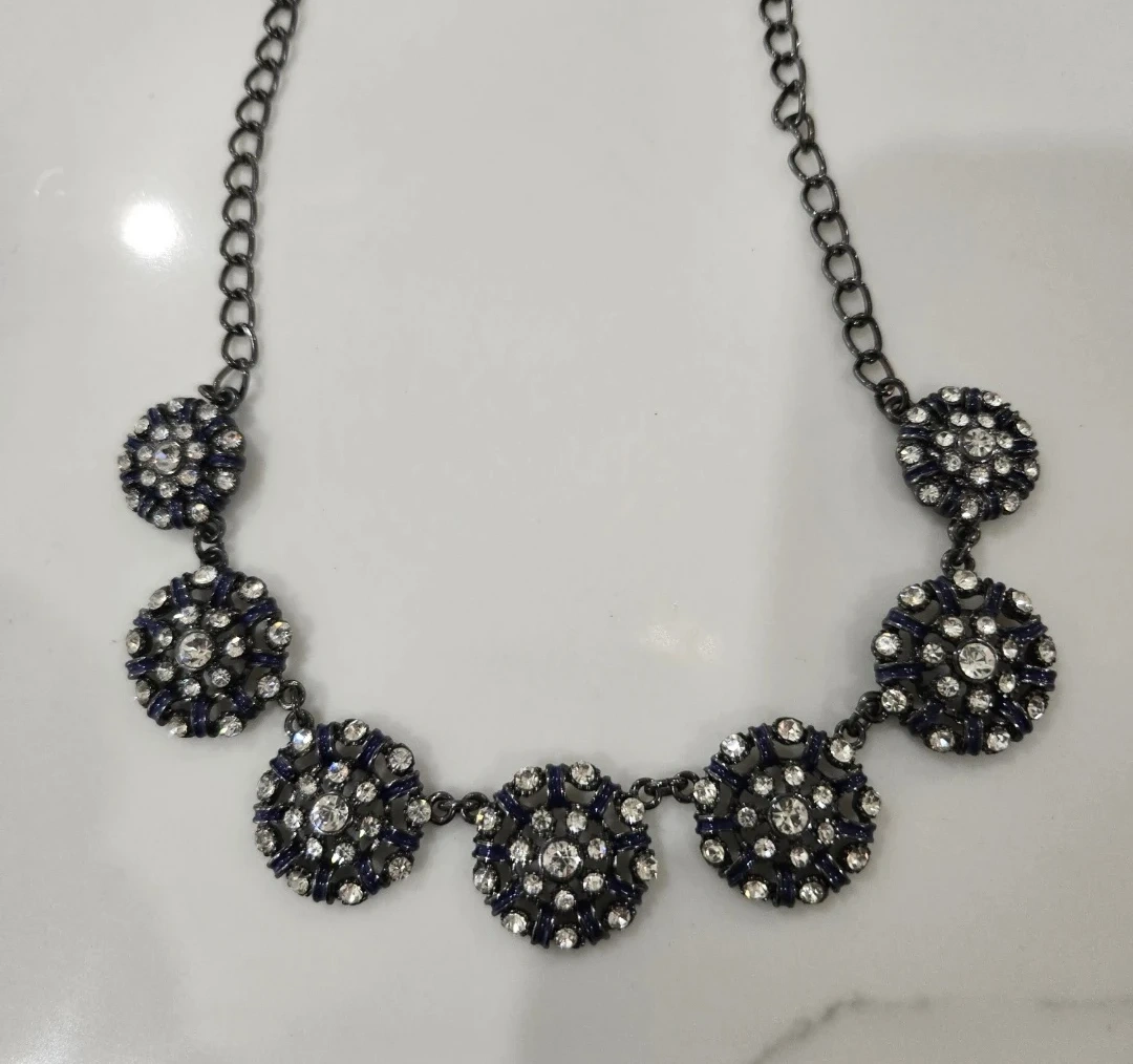 Selling a dark grey statement necklace with floral accents. It's in great condition and would be a lovely addition to any outfit!