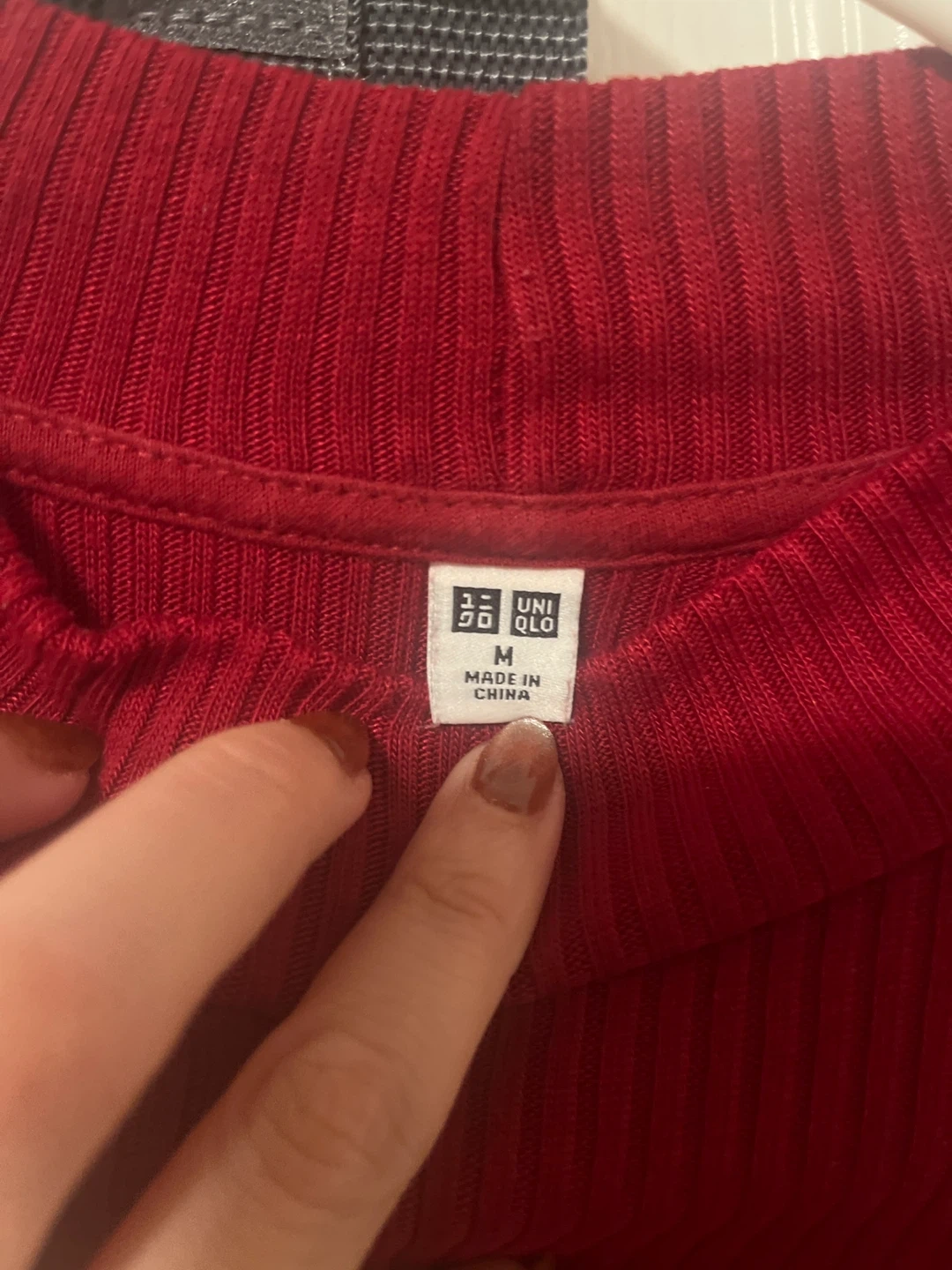 Selling a Uniqlo long-sleeve top in a lovely shade of red! It's a ribbed material and a size M. Perfect for layering or wearing on its own