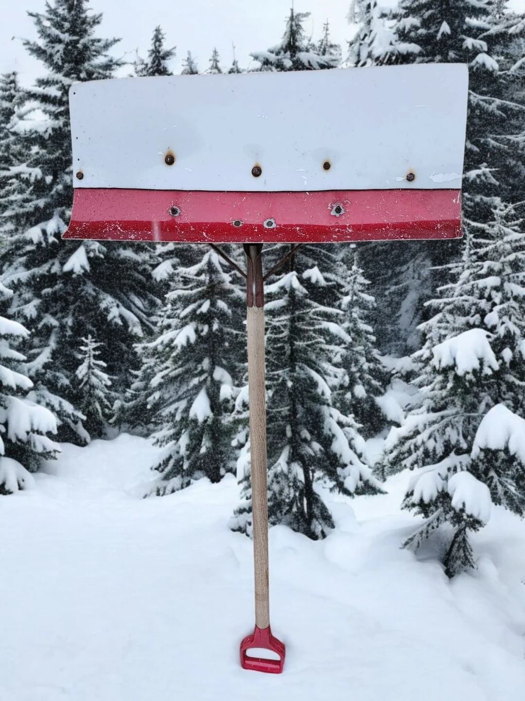 The shovels have white aluminum blades with a reinforced red plastic or poly bottom edge, which helps prevent premature wear and is ideal for asphalt or paving stone driveways. The handles appear to be made of wood.