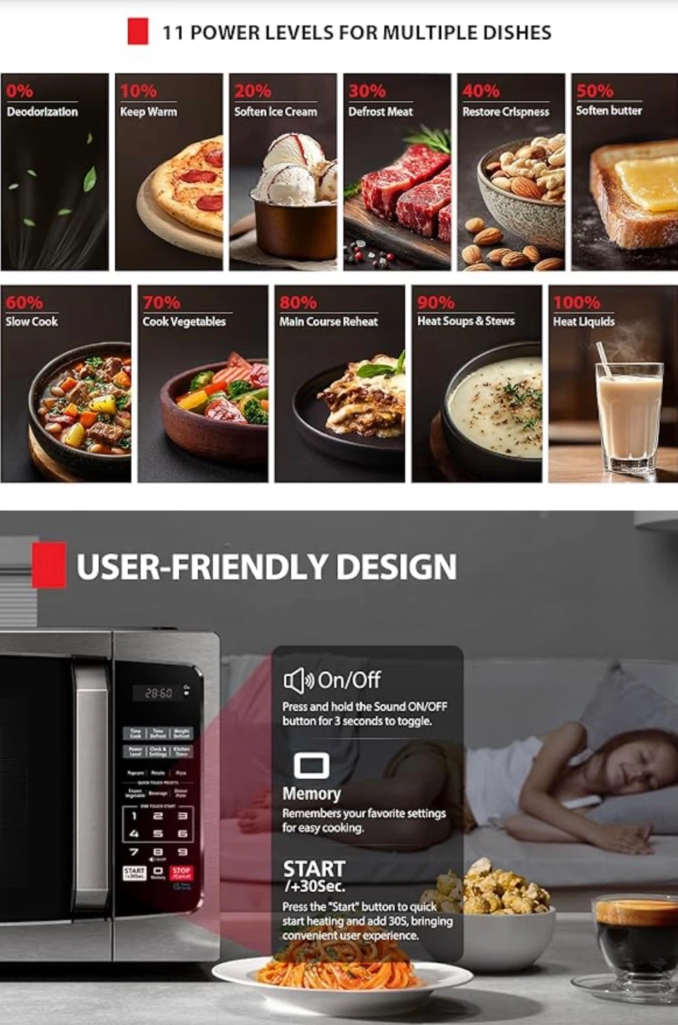 Selling a Toshiba microwave oven, model ML-EM25P(SS). It features 11 power levels for multiple dishes and 6 auto menu options for your daily needs. User-friendly design with bright LED light inside, and child lock, and much more.