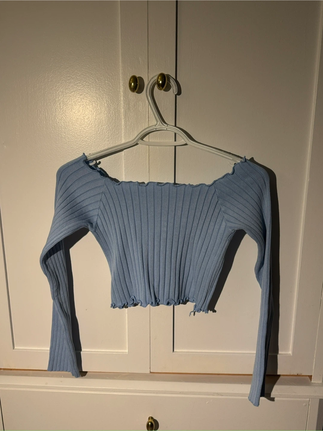 A cute and stylish blue ribbed off-the-shoulder crop top! It's in great condition and ready for a new home. Perfect for adding a pop of colour to your wardrobe