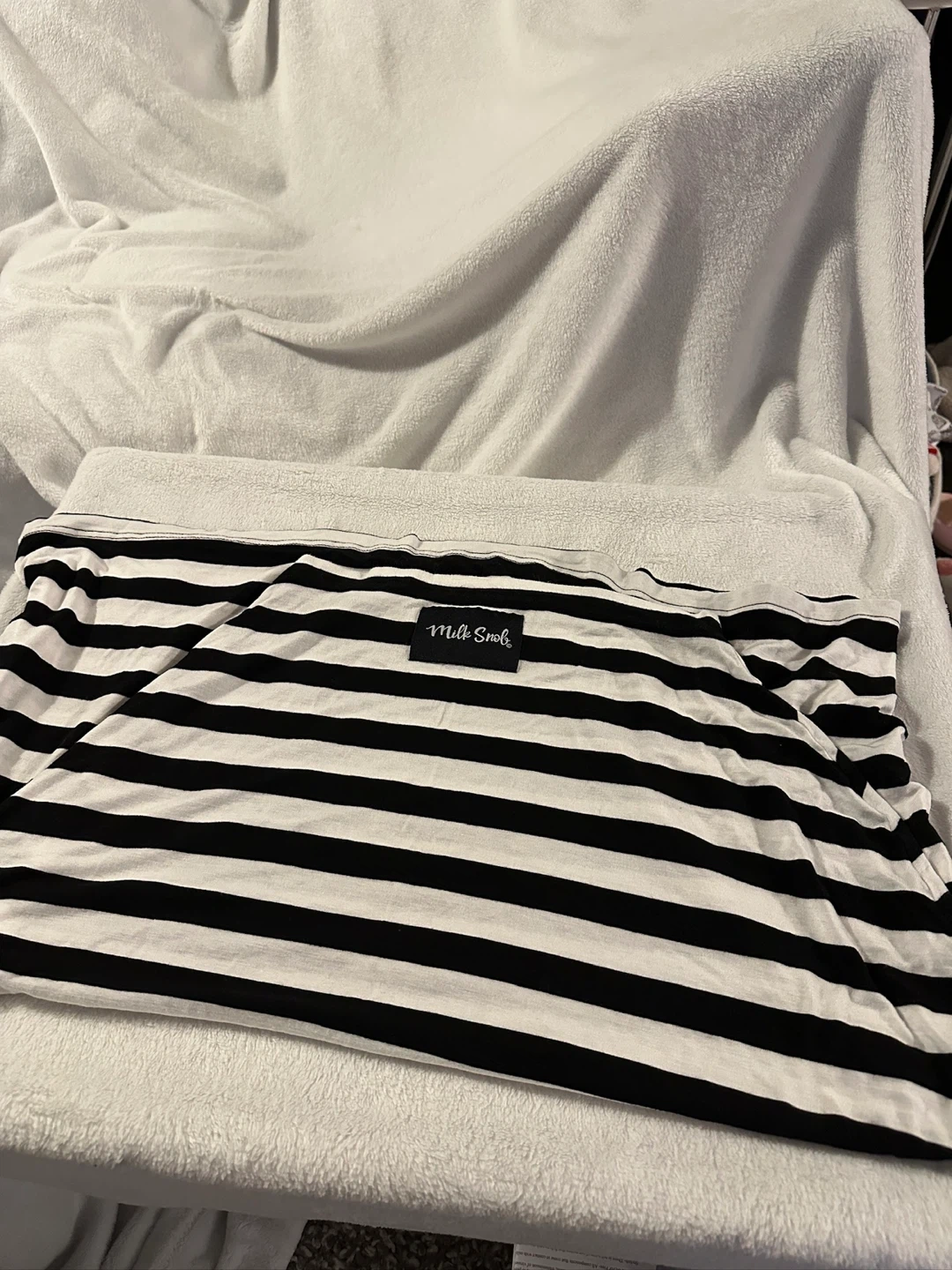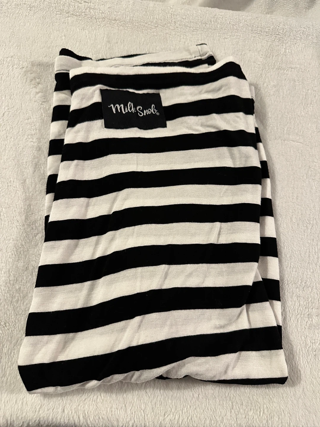 18Selling a Milk Snob car seat cover in a classic black and white stripe pattern! It's in great condition and ready to keep your little one cozy and protected.