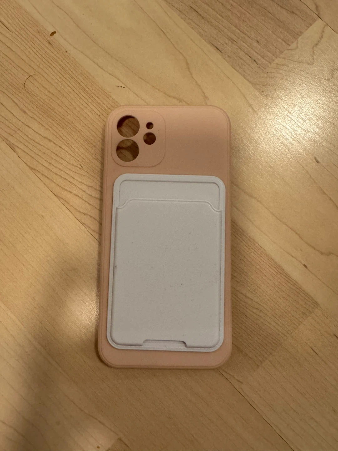 Selling a peach-coloured iPhone 12 case with a built-in card holder. It's in great shape and ready to keep your phone protected and your cards handy!