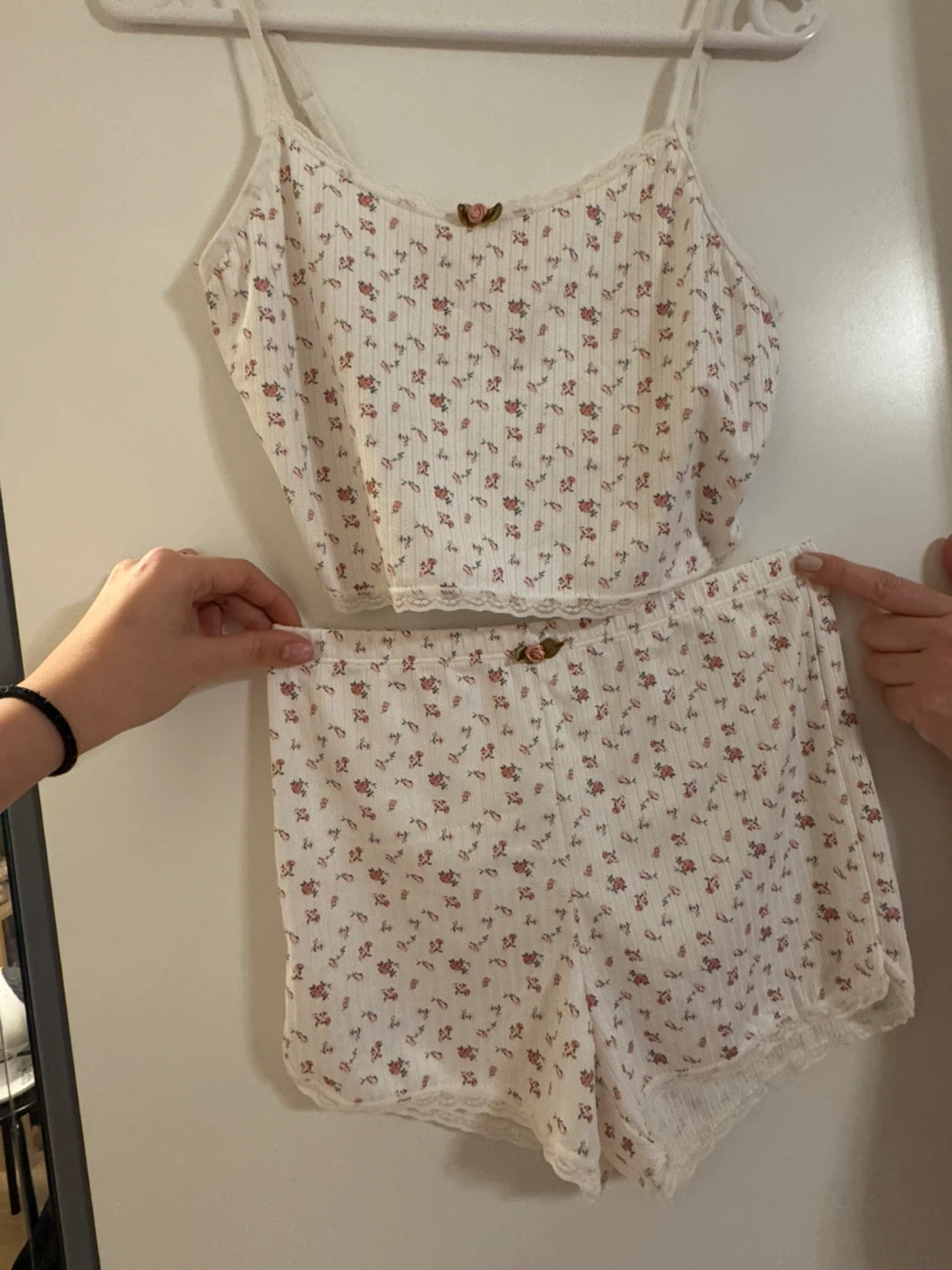 10Cute cami and shorts set with a floral print! It's a matching set perfect for lounging or sleeping in. The cami has thin straps and a lace trim, and the shorts are a comfortable fit with a similar lace detail. Great for summer nights!