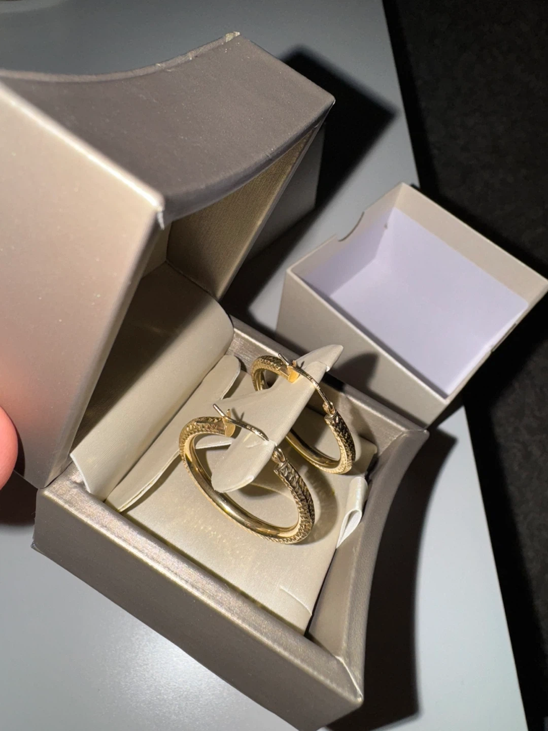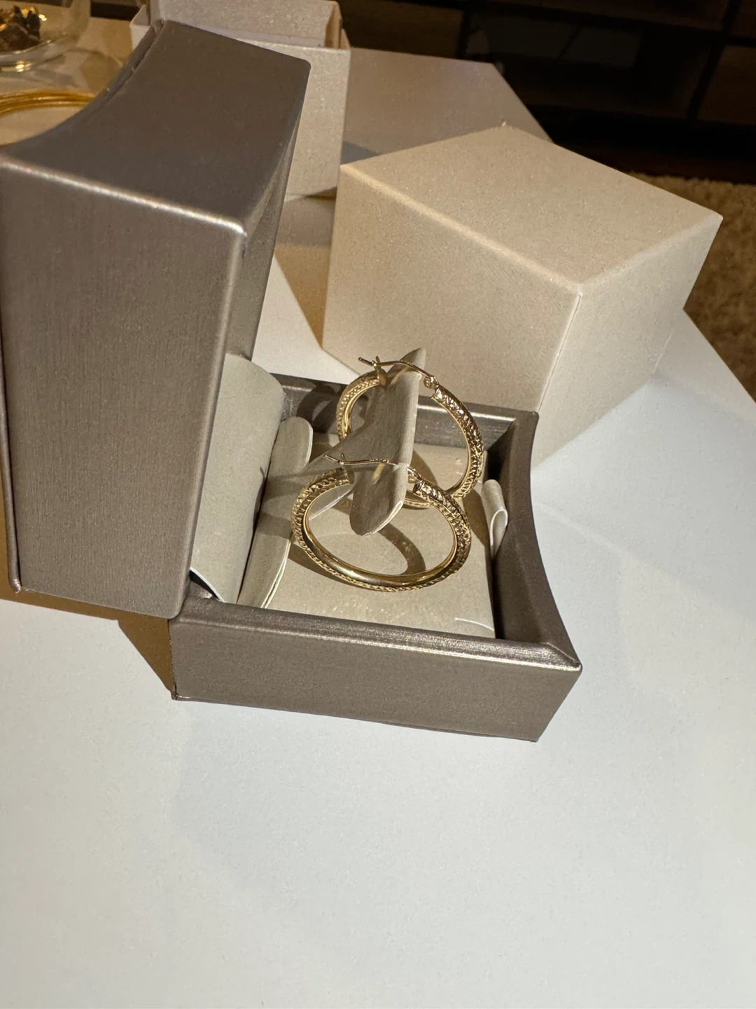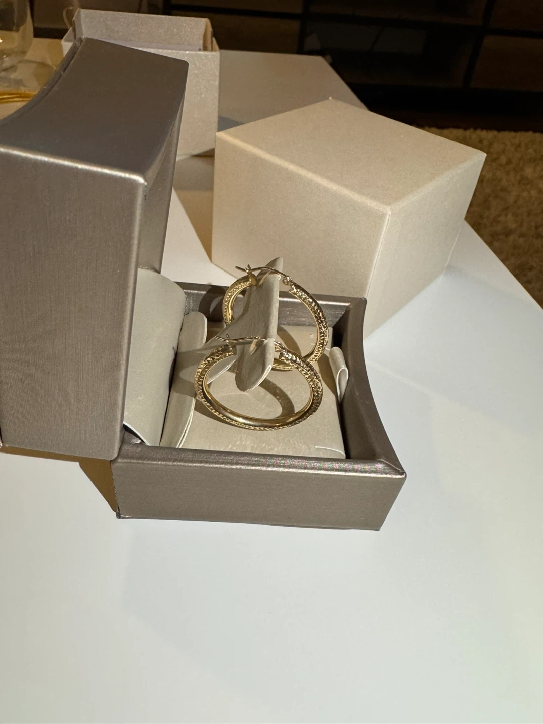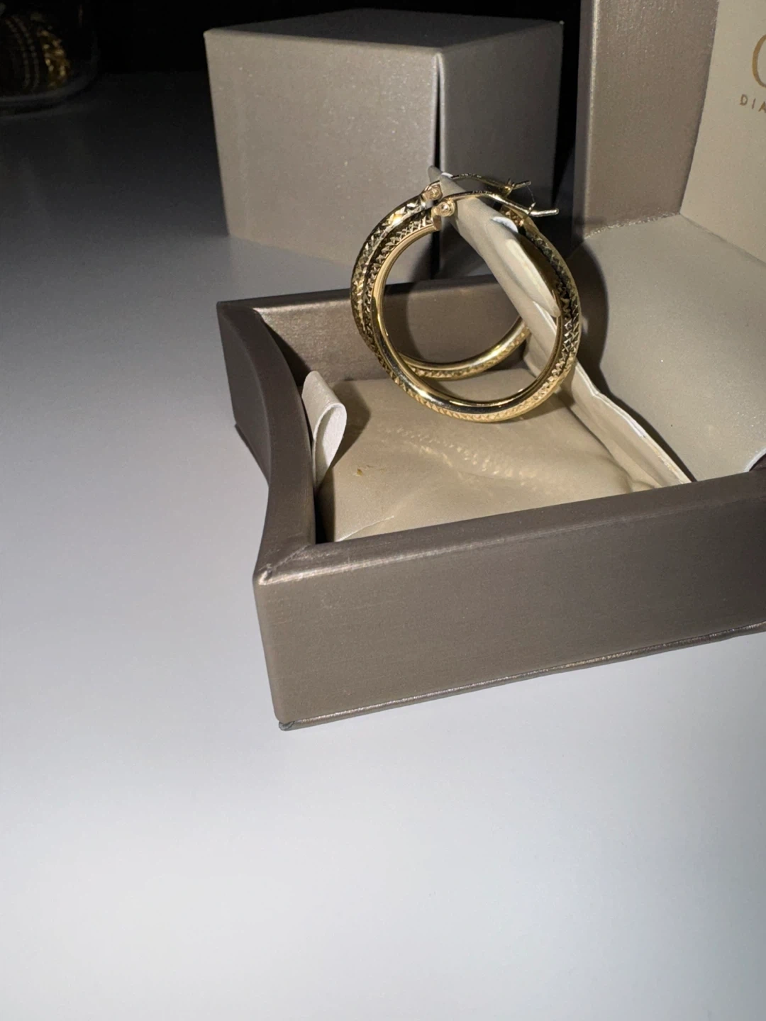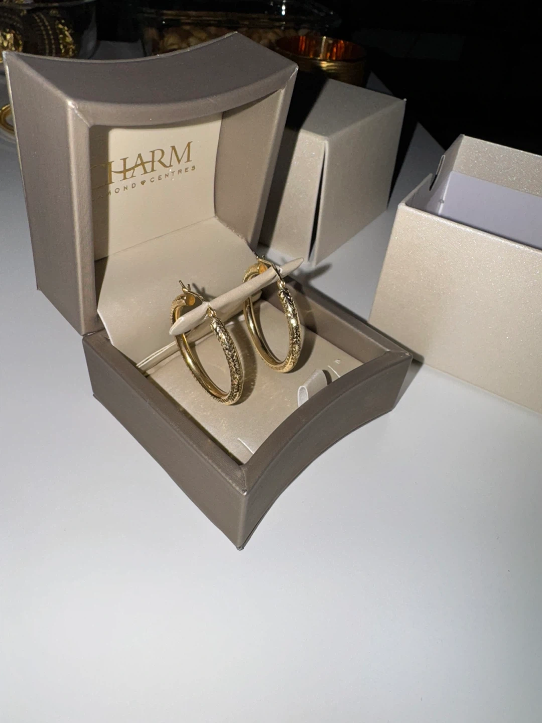 These are a pair of gold hoop earrings from Charm Diamond Centres. They come with their original box and are in great condition!