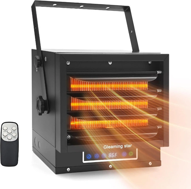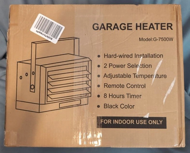 Factory sealed, never used. Constructed from SPCC cold-rolled steel. 6,500 to 7,500 Watt forced air fan. Max BTU - 25,590. Heats up to to 900 sq ft. 2 heat settings. 45°F to 95°F. Timer from 1 to 8 hours. ETL certified safety parameters. Automatic fan delay function. Power cord not included; must be hardwired & grounded. Current Amazon.ca price for the Gleaming Star Fan-Forced Wall/Ceiling Mount Garage/Shop Heater with Remote Control: $279.99. You get this brand new, never used item at a really good price. Box is unopened, sealed by the manufacturer, and the device is completely brand new. Cash only. Pickup in Etobicoke or Mississauga: Email me to make arrangements.