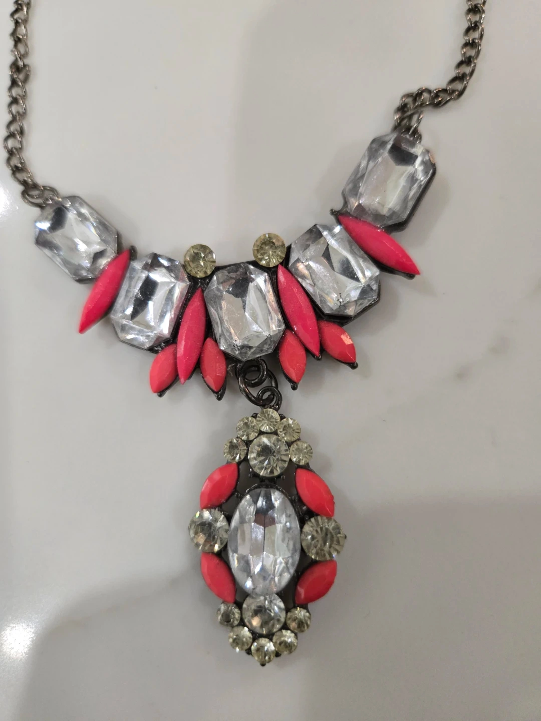 Selling a beautiful fashion necklace! It features red, white, and silver stones in a unique design. The chain is a dark silver colour. It's in great condition and would be a lovely addition to any outfit