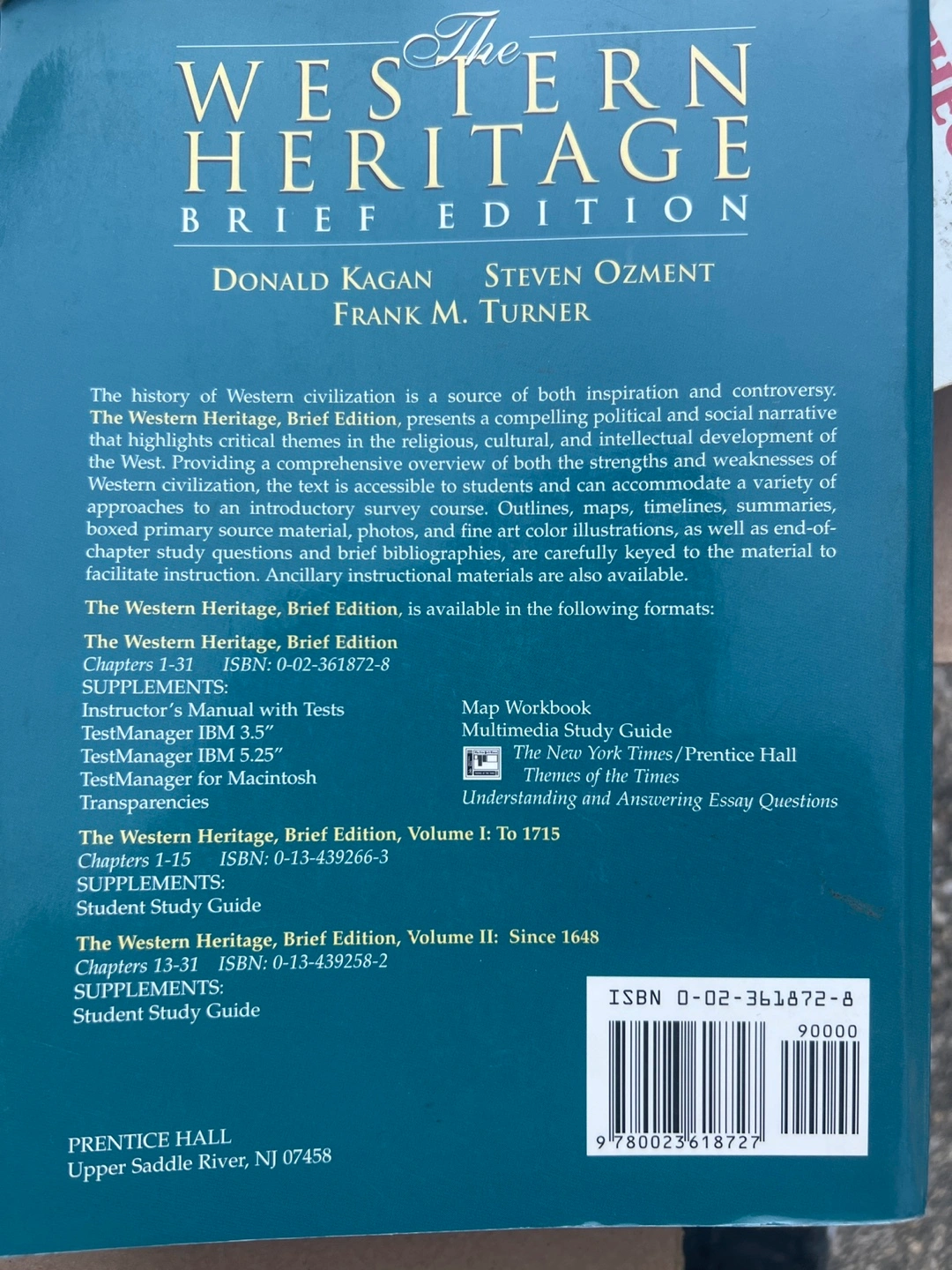 Selling The Western Heritage Brief Edition. It's a comprehensive overview of western civilization, presenting a compelling political and social narrative. Authored by Donald Kagan, Steven Ozment, and Frank M. Turner, this book is suitable for an introductory survey course. Originally priced at $48.90