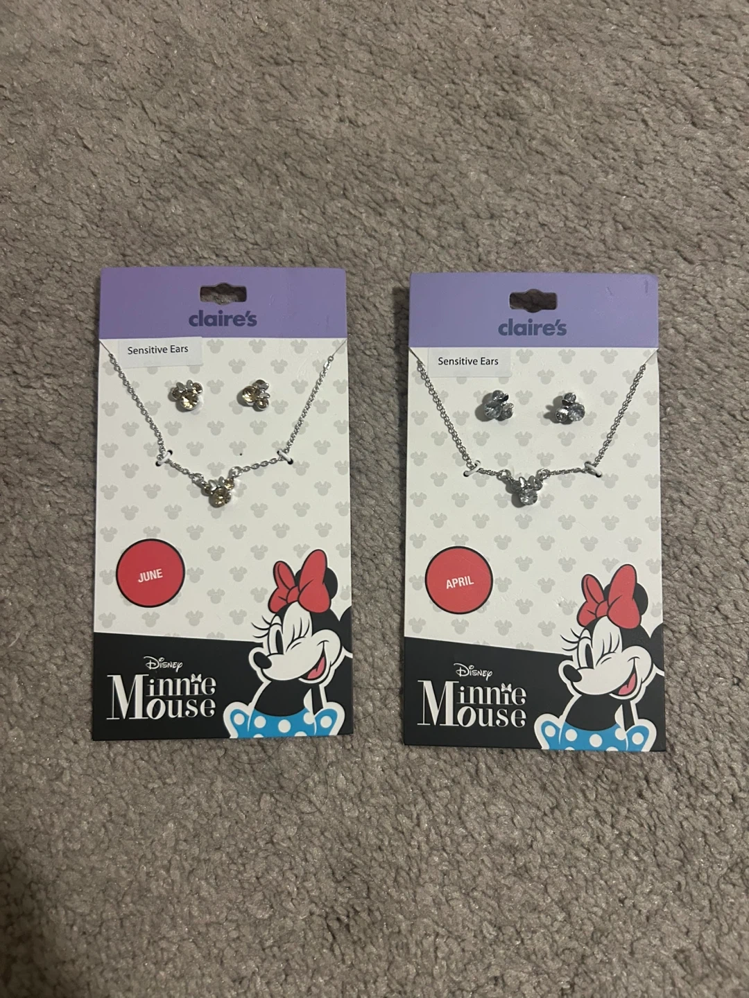 This is an adorable Claire's Disney Minnie Mouse necklace and earring set. It's perfect for any Disney fan!—Minnie Mouse pendant necklace and matching stud earrings.