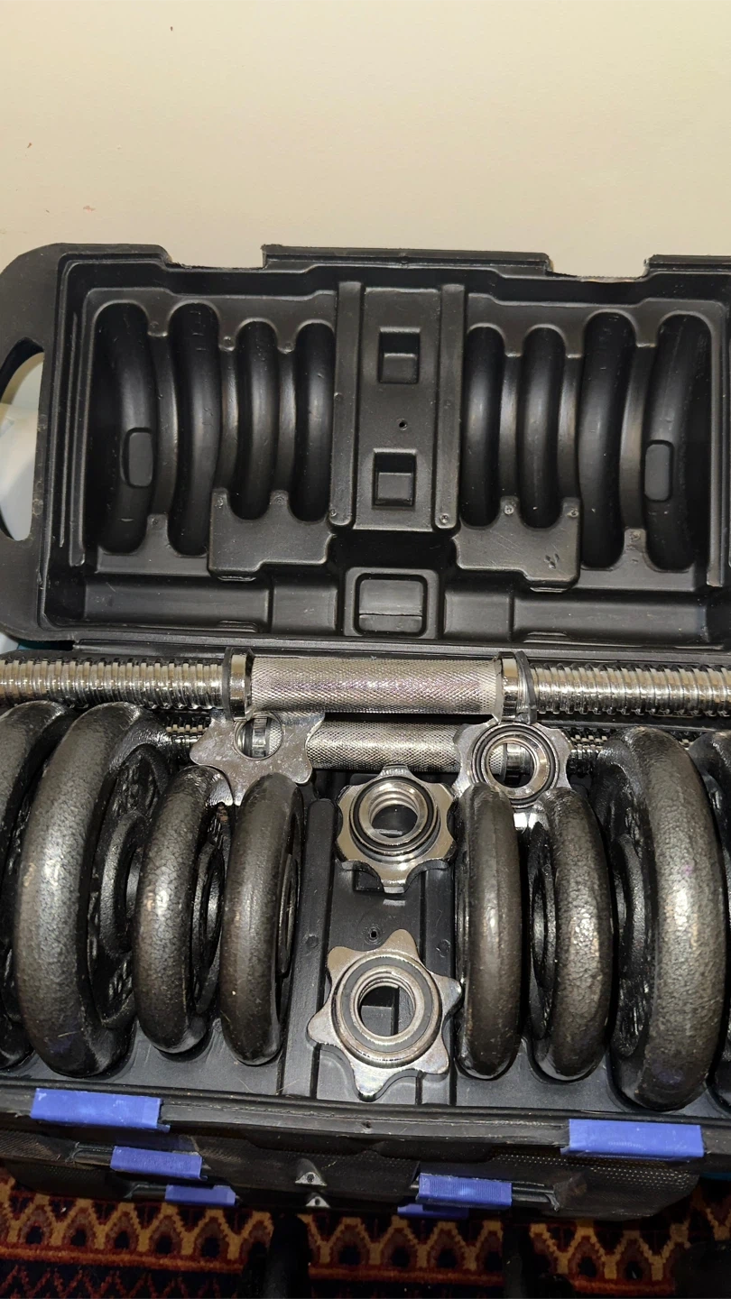 Selling a dumbbell set that comes with its own carrying case! Perfect for home workouts and easy storage. All pieces are included and in good condition.