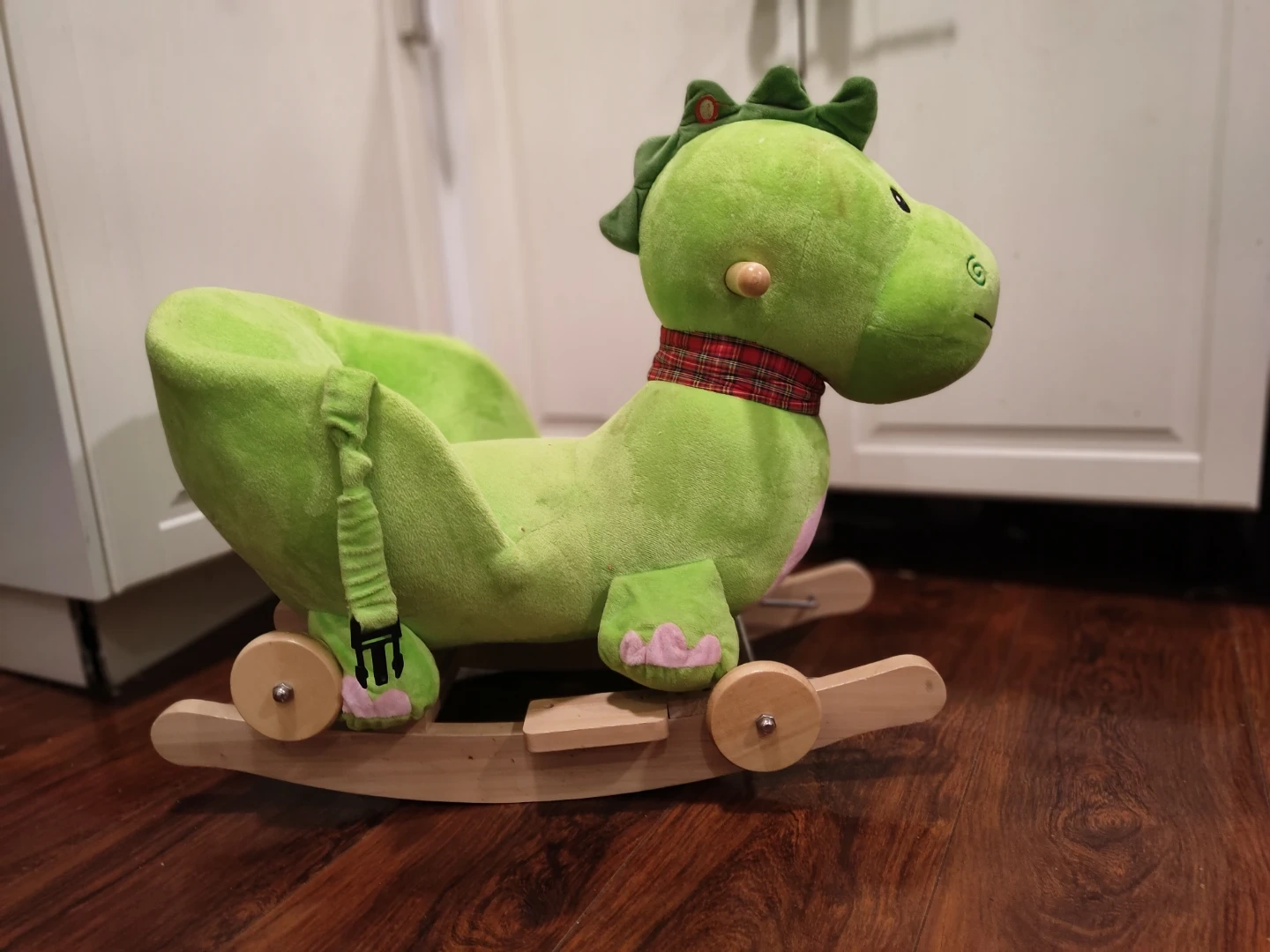Here's a cute, gently used green plush dinosaur rocking chair! It's perfect for toddlers and young children. The rocking base is made of wood, and the plush dinosaur is soft and cuddly. It's in great condition and ready for a new home!