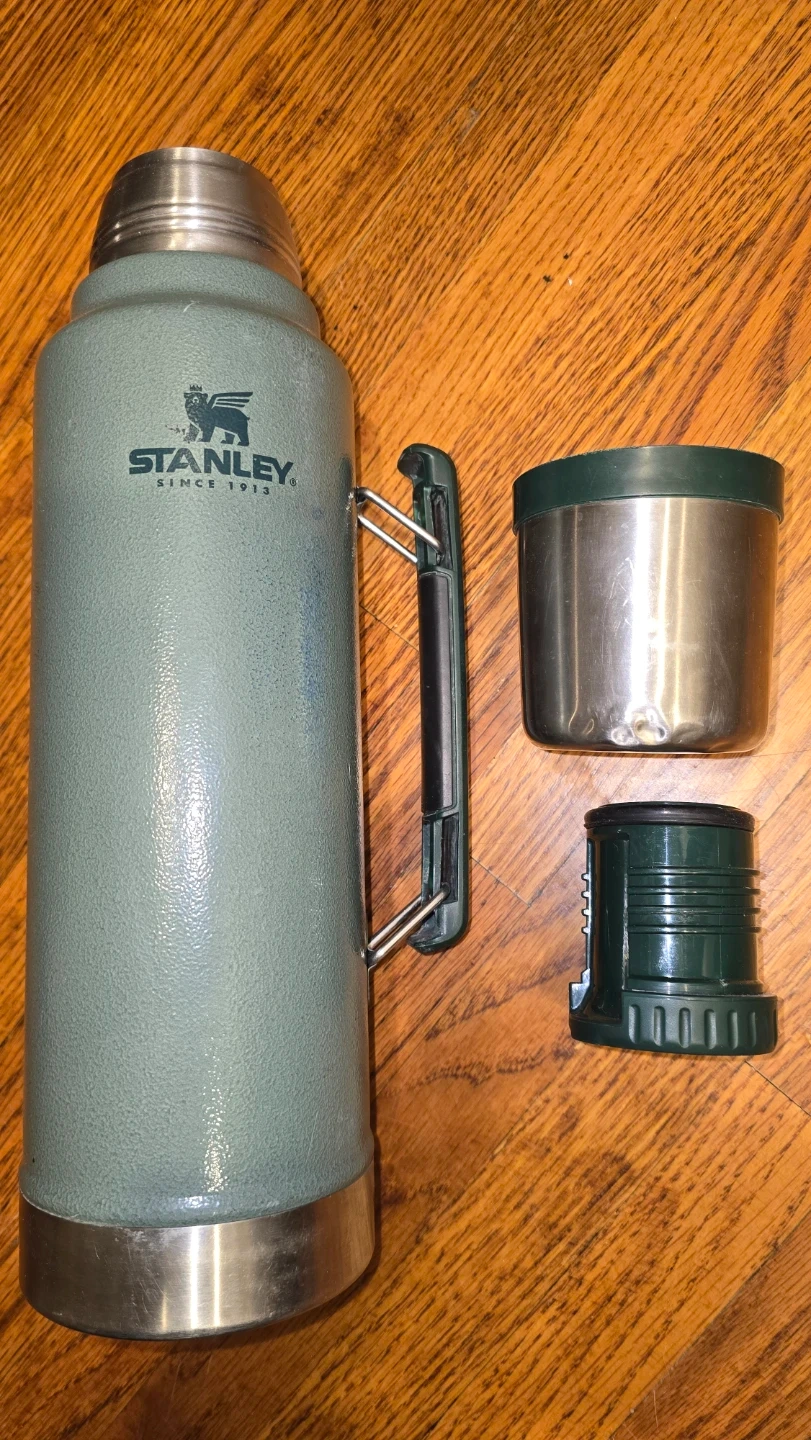 Selling a Stanley Classic Vacuum Bottle. It's in great shape and ready to keep your drinks hot or cold! Comes with the cup lid and a screw in plug with rubber (has a few dents I had to bang it to get it open my hands are too small I'm a petite female this thing is too heavy for me to carry it's too big but it's in great condition other than the dents😁 ) used 2x is clean with no odor only had hot water in it and it stayed hot for quite a long time with water from the cattle was still scorching 🔥 🥵 hot!