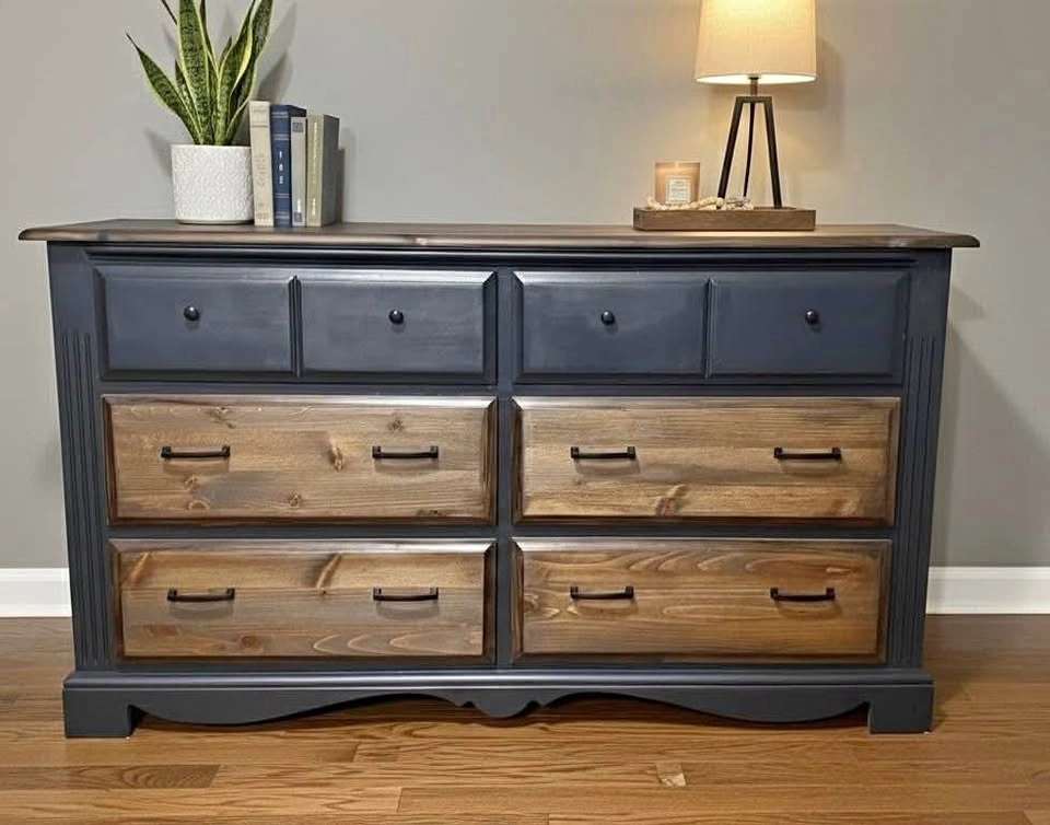 Add a touch of modern rustic charm to your bedroom, entryway, or living space with this stunning solid wood dresser. Recently refinished and sealed for protection, this piece boasts a bold two-tone finish, pairing a sleek matte black frame with warm, stained wood drawers and top.