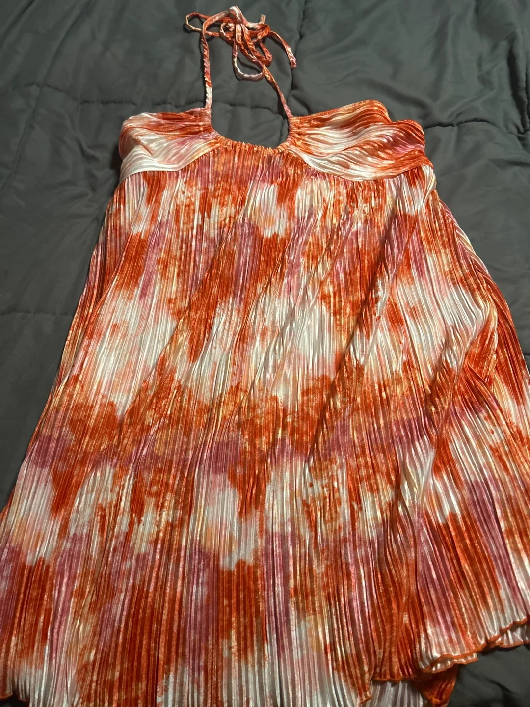 Selling a cute SHEIN halter dress in size L! The dress is a vibrant orange colour with a unique pleated texture. It's made of 95% Polyester and 5% Elastane, making it comfy and easy to wear