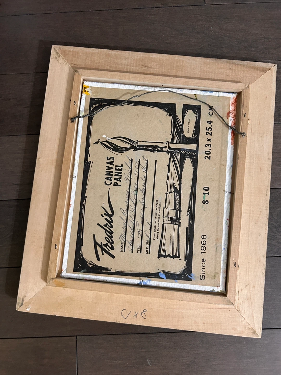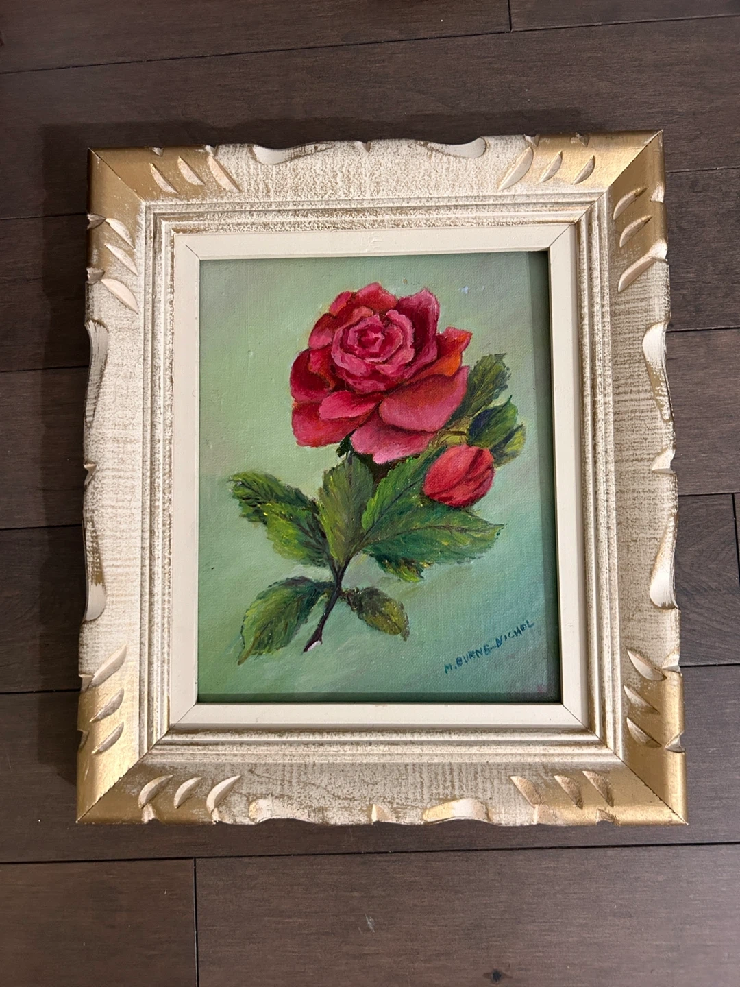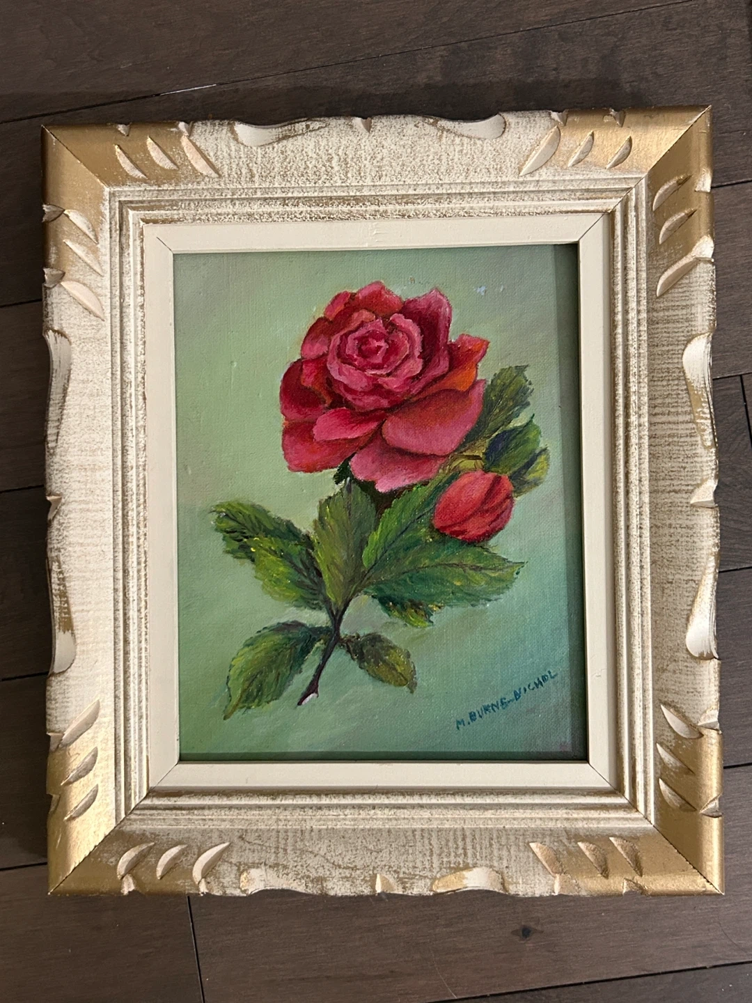 Antique wood frame and A lovely rose painting on a Fredrix canvas panel. It's a beautiful piece ready to brighten up any room!