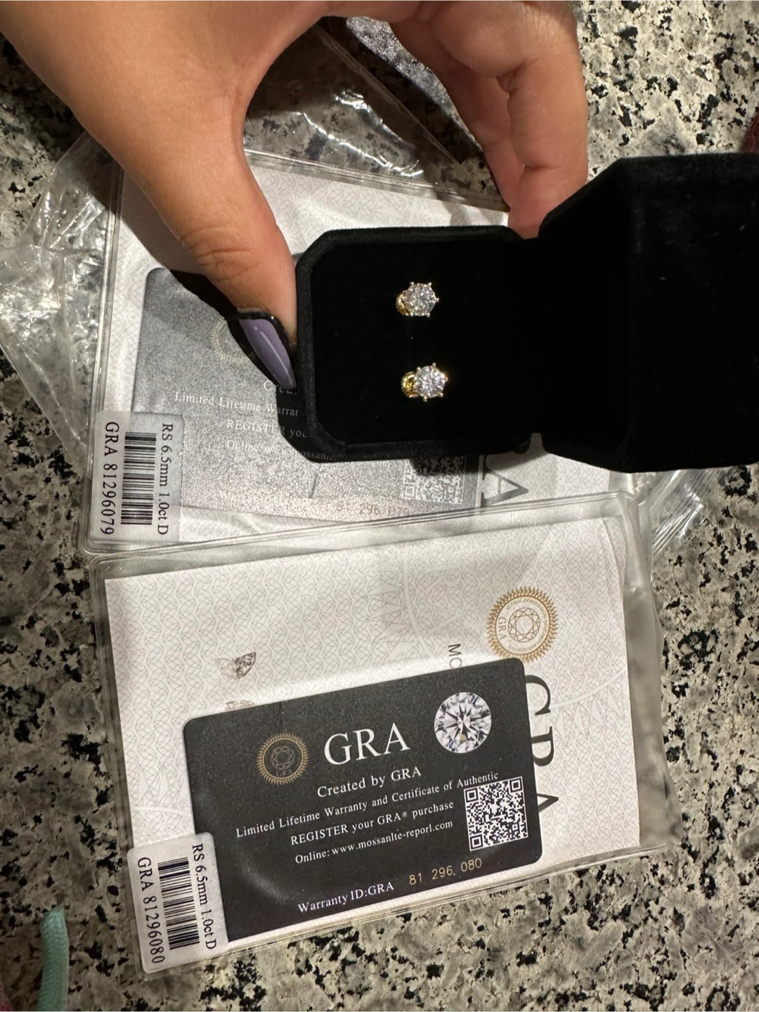 119moissanite stud earrings. They are brand new 2ct(1ct*2) The size is 6.5mm. 925 sliver cover gold Plating