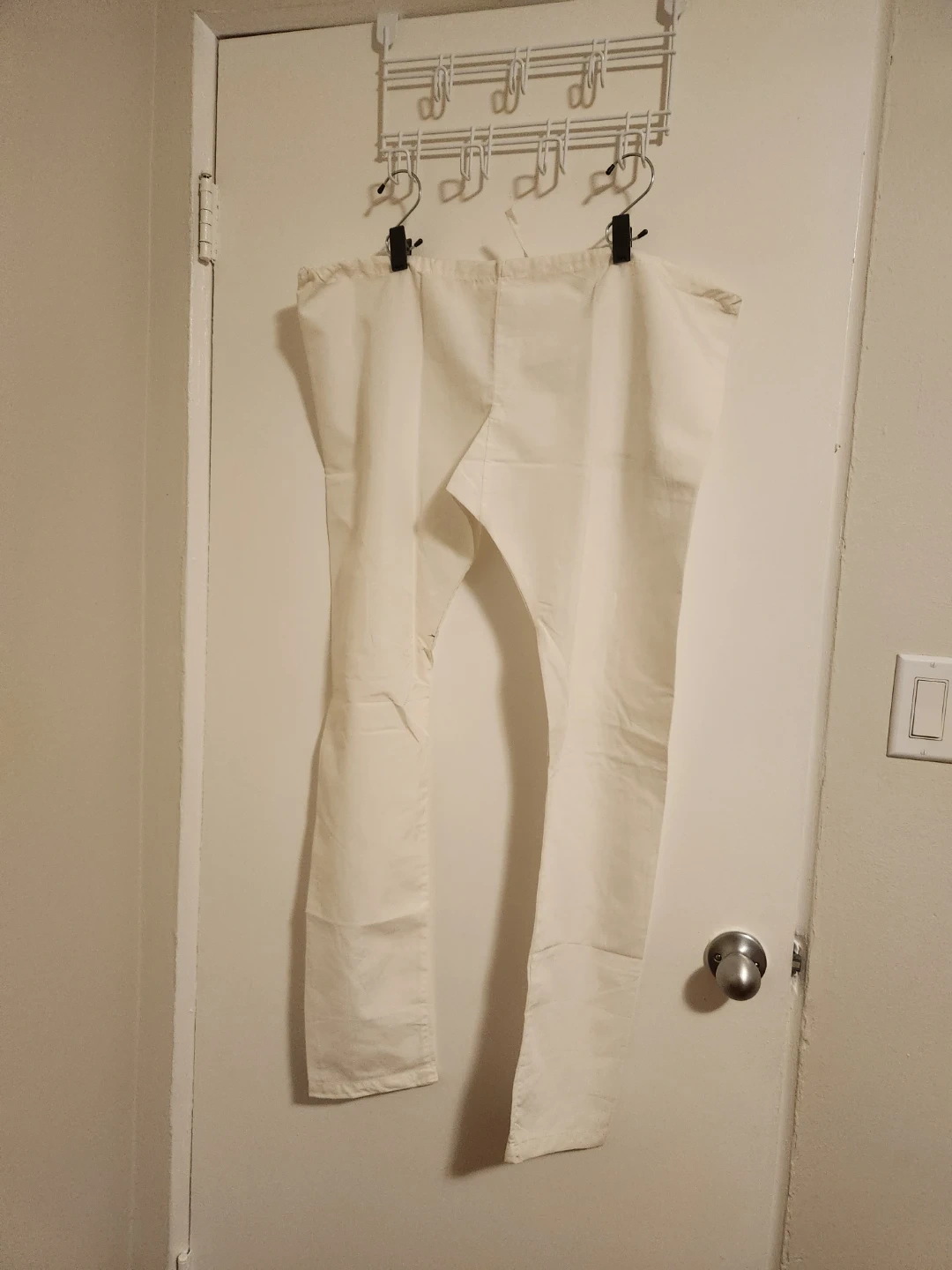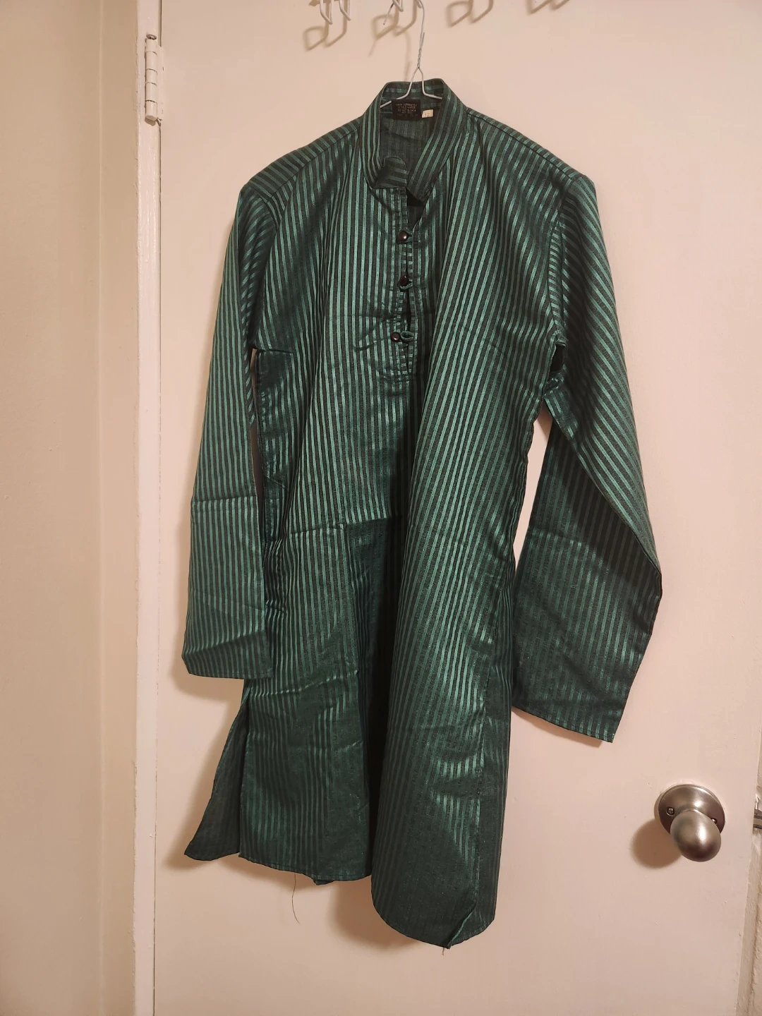 Selling a men's kurta and pants set. The kurta is a dark green with vertical stripes, and the pants are white. Perfect for a traditional look!