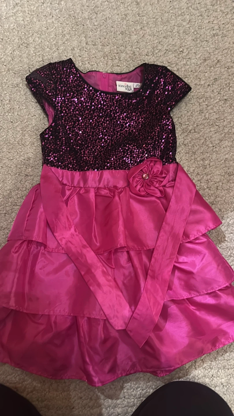 A cute Samara Kids dress in size 6! The top is a sparkly black and the skirt is a bright pink with ruffles. It has a flower detail at the waist with a tie.