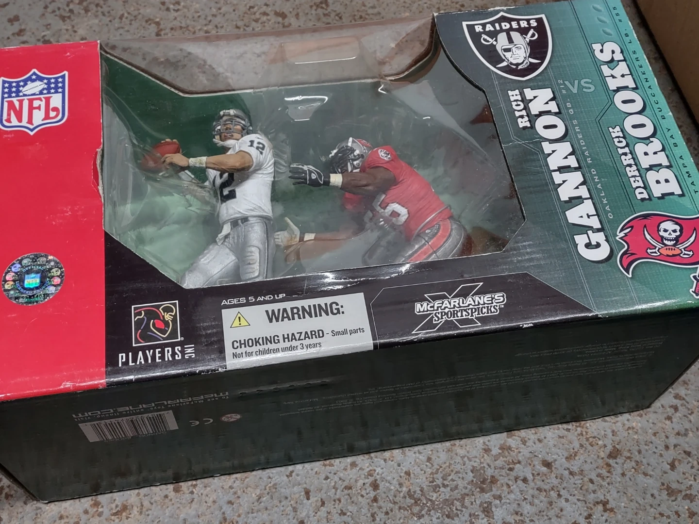 Selling a McFarlane SportsPicks NFL figure featuring Rich Gannon vs Derrick Brooks. It's for ages 5 and up. The box has some wear, but the figures inside are in great shape!