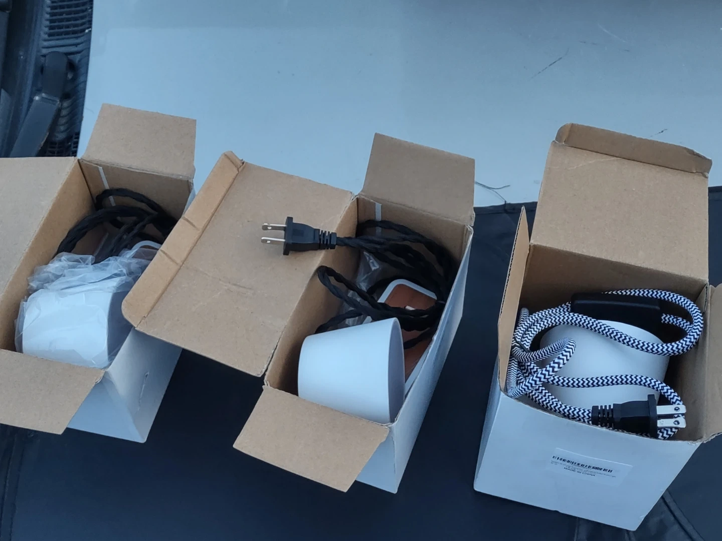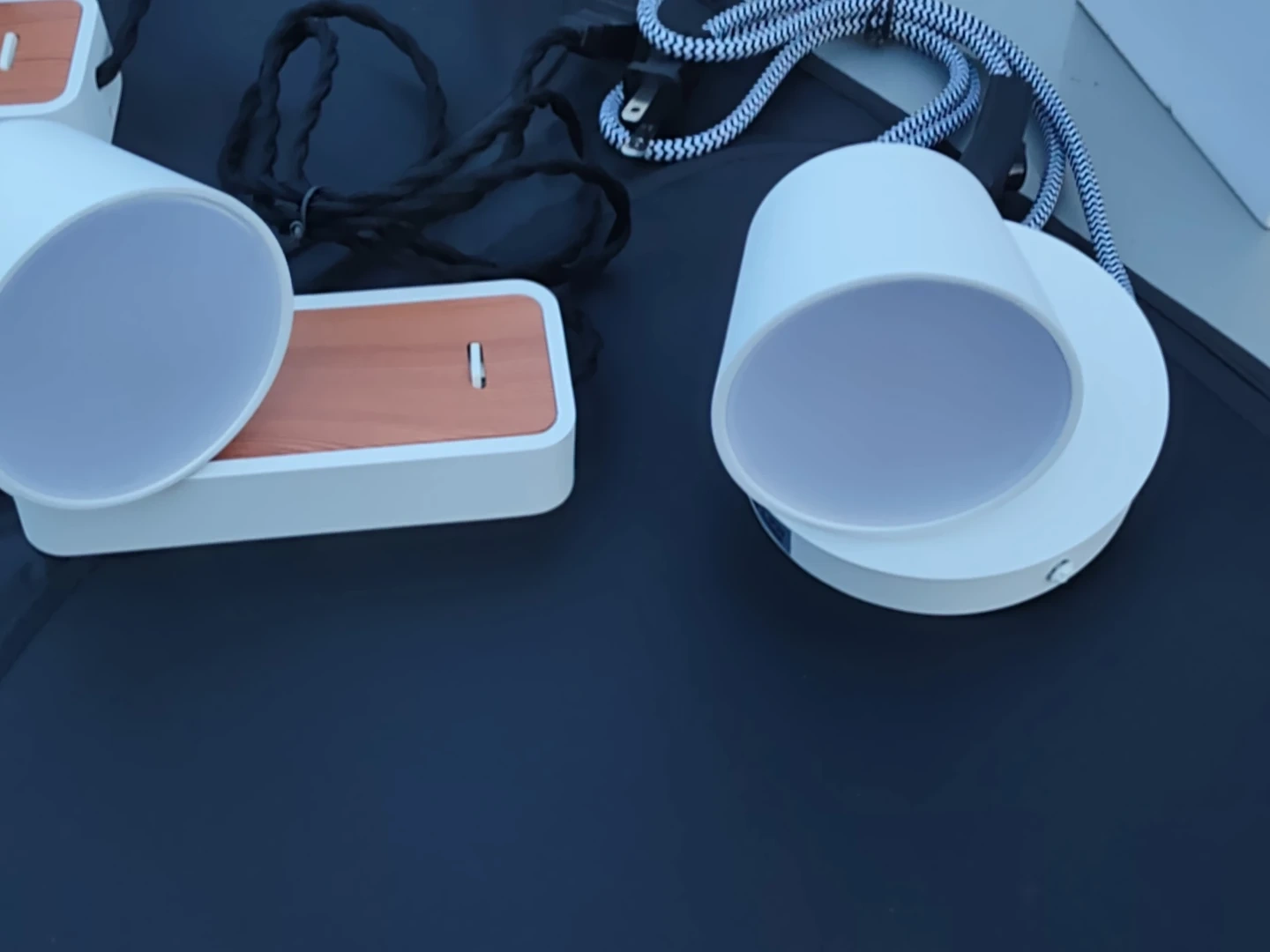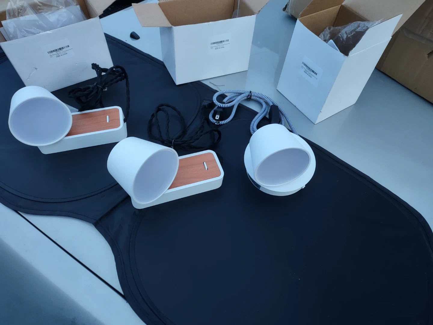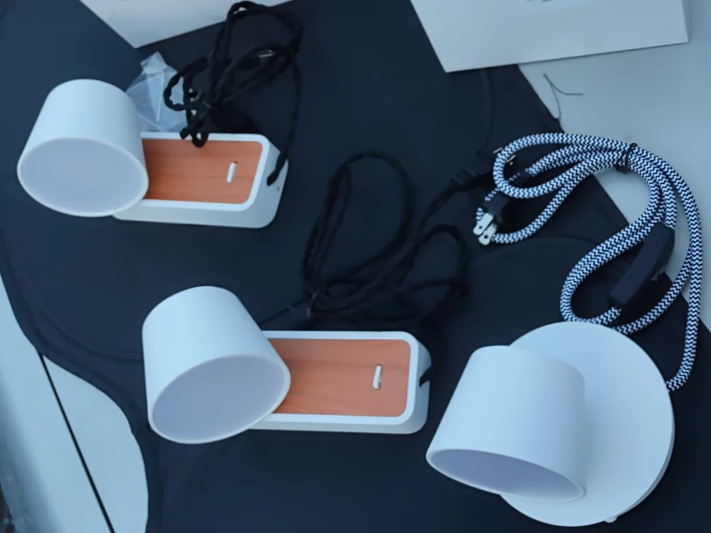 0Selling a set of three table lamps! They feature a white cylindrical shade and a wood-look base. The lamps come with their original boxes and include the necessary cords for easy setup