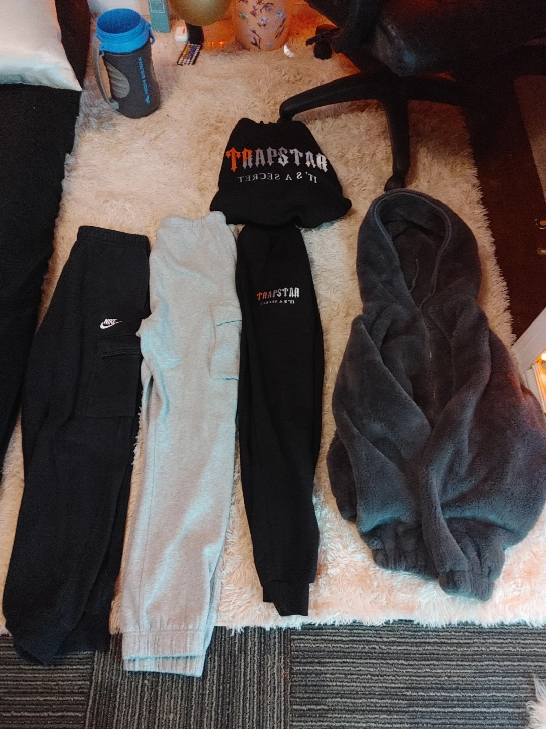 20closet cleanout trying to sell asap can also take offers dm! black nike sweats-25$ grey kolby sweats-15$ fluffy jacket-35$ for all -95,willing to lower price good reps of trapstart set -taking offers dm me!