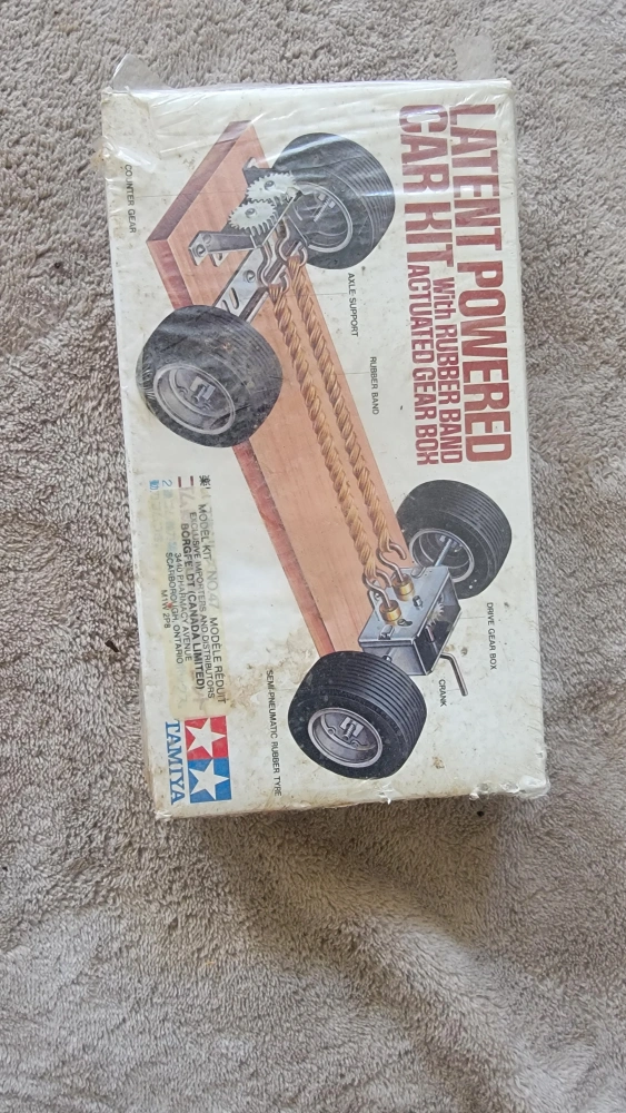 Selling a Tamiya Latent Powered Car Kit with Rubber Band Actuated Gear Box, Model Kit No.47. It comes with semi-pneumatic rubber tires and all the parts to build your own rubber band powered car!