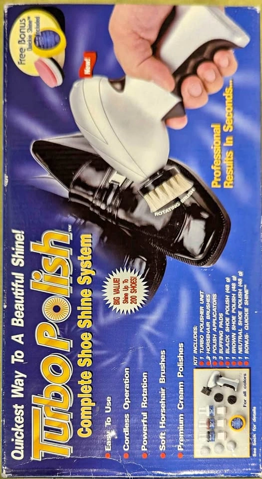 The Turbo Polish Complete Shoe Shine System, the ultimate solution for all your shoe care needs. This system includes everything you need to keep your shoes looking polished and shiny.