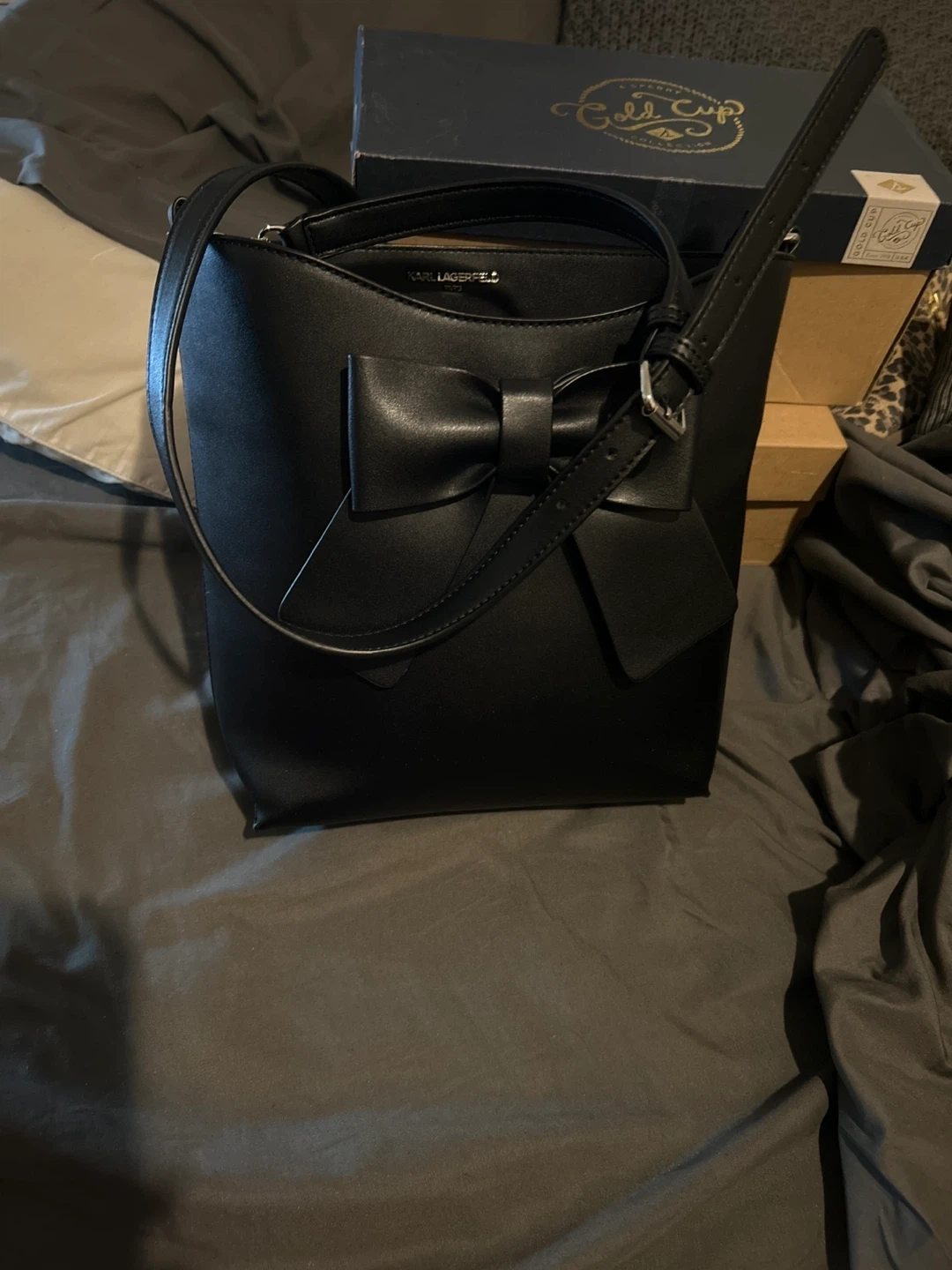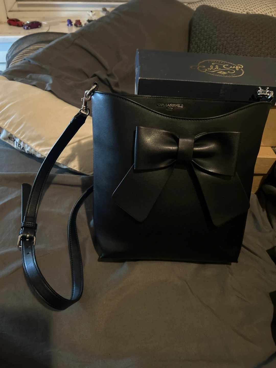 Here's a stylish black bucket bag from Karl Lagerfeld Paris! It features a cute bow detail and a long strap for easy carrying. Perfect for adding a touch of elegance to your everyday look