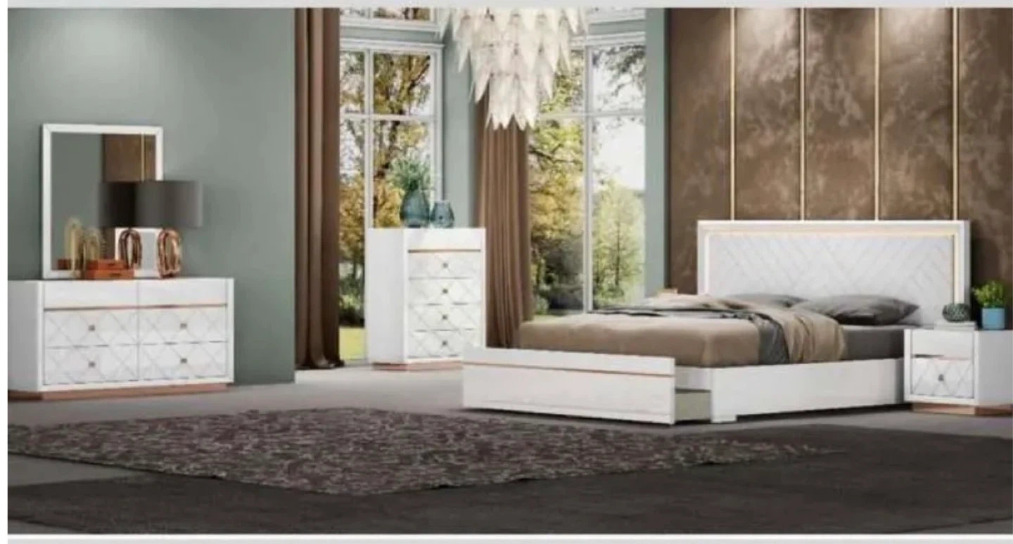 Bedroom set in white with gold accents. Includes bed frame, nightstand, dresser, and chest of drawers. Great condition!