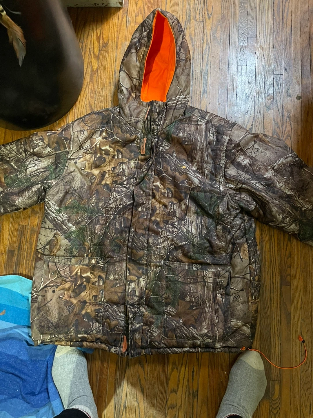 Selling an OXGEAR hunting jacket with a camouflage exterior and bright orange interior! It's in great shape and ready for your next outdoor adventure call or text 519 933 7860 jacket is 2x
