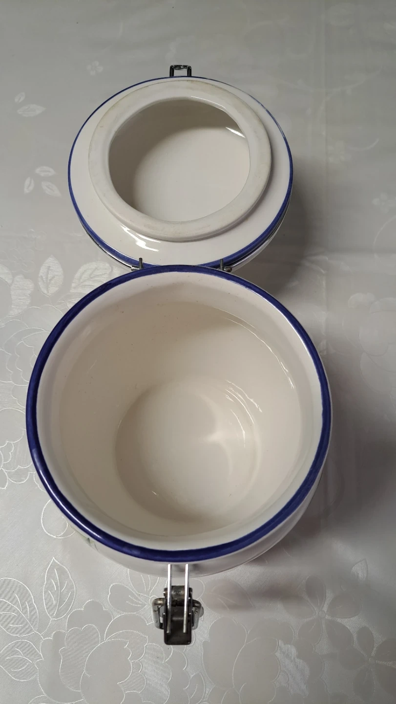 White ceramic storage jar with a decorative fruit and leaf pattern. It features a blue rim and a secure latch closure. This canister is suitable for storing dry goods or countertop items.